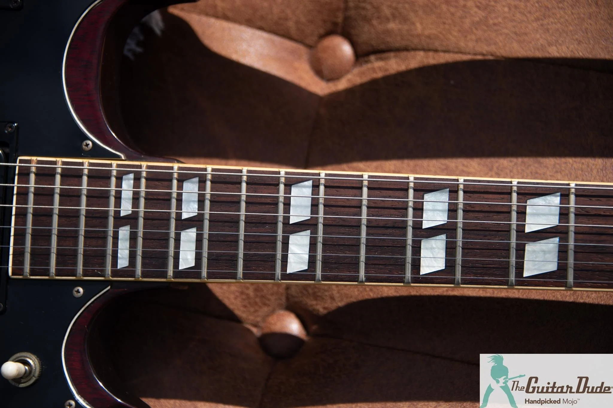 Cherry red finish that still pops like it did fresh off the Fujigen line in 1980. Solid Honduran mahogany body with those classic beveled SG-style double-cutaways for killer access and lightweight comfort (weighs in right around 11 lbs – balanced and ready to rock). Mahogany necks with that perfect medium-C profile (one-piece quartersawn goodness), rosewood fretboards with 12” radius, mother-of-pearl split parallelogram inlays, and set-in construction that joins at the 15th fret for buttery playability on both necks.