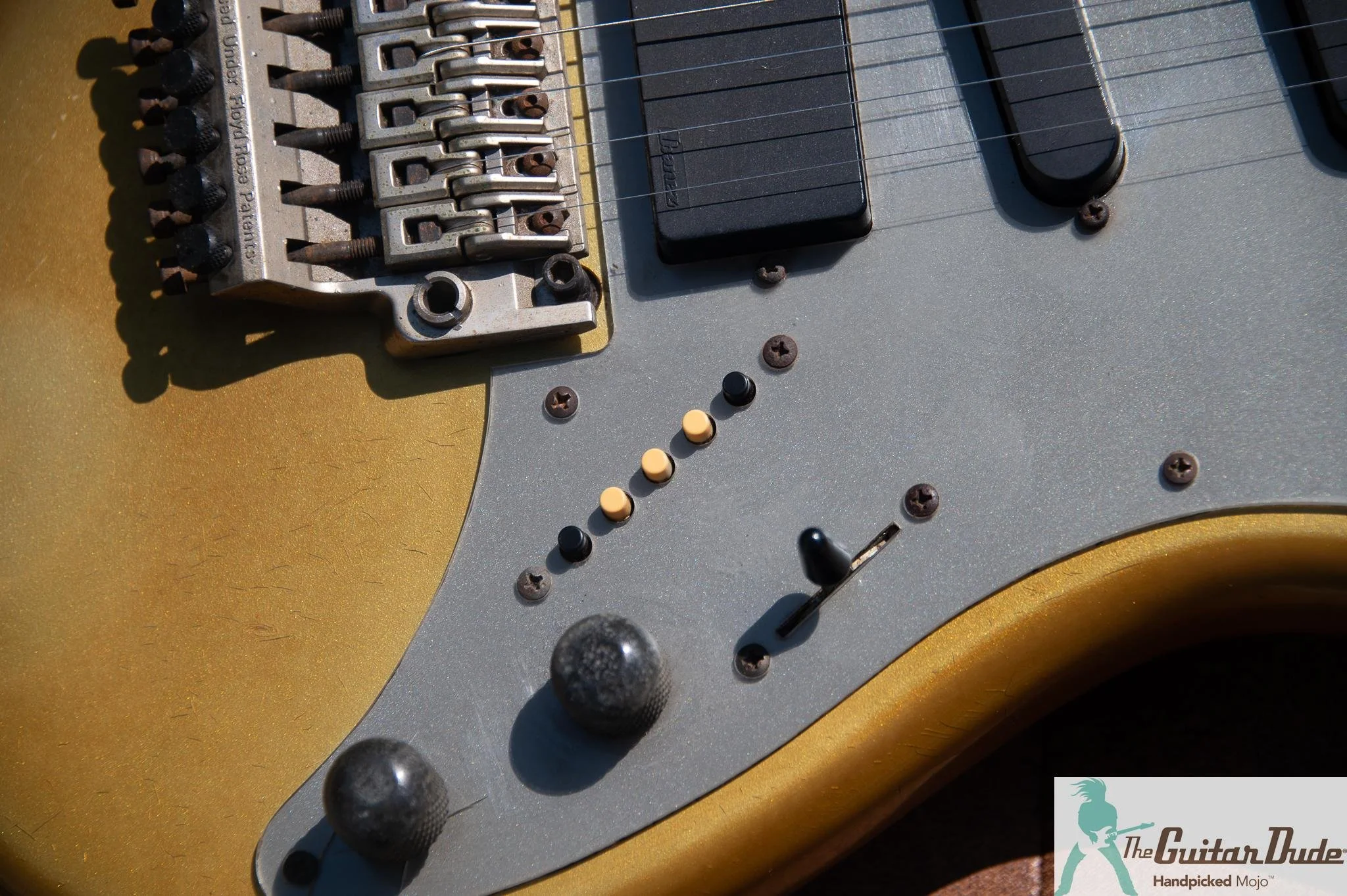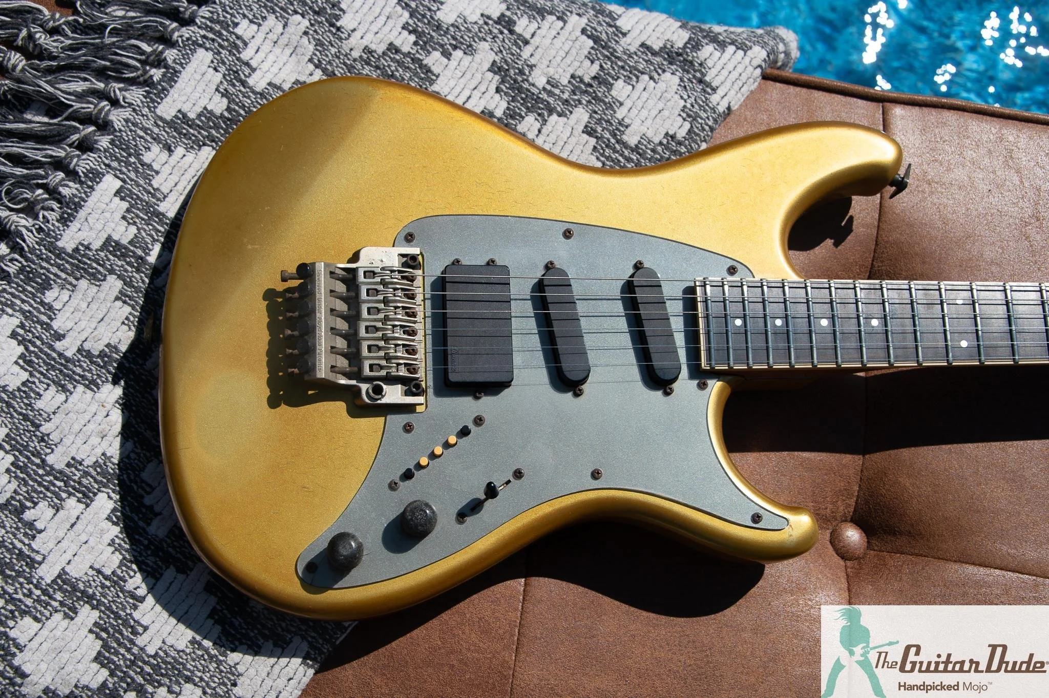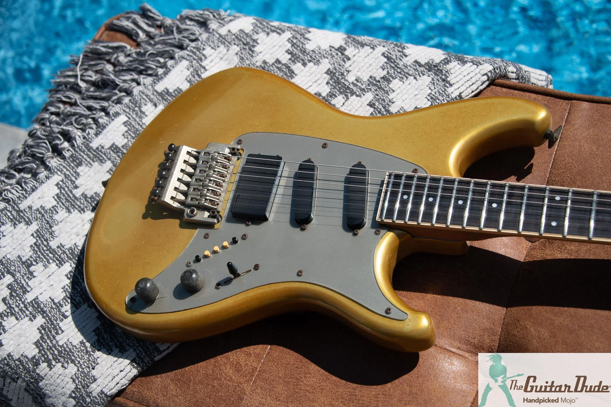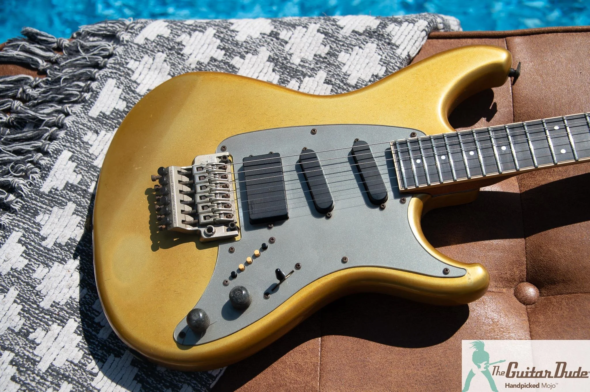 Picture this: a shimmering Gold Pearl finish that catches light like liquid gold, offset double-cutaway alder body with those sleek, rounded ’80s contours that feel like they were carved for speed. The bolt-on maple neck (the direct ancestor of the legendary Wizard profile) is slim, fast, and buttery-smooth – 22 jumbo frets on a bound ebony fingerboard with classy abalone dots that pop against the dark wood. It’s the kind of neck that makes you want to rip up and down the fretboard for hours.