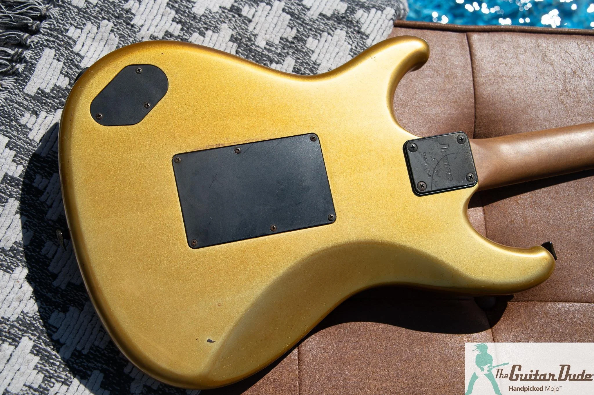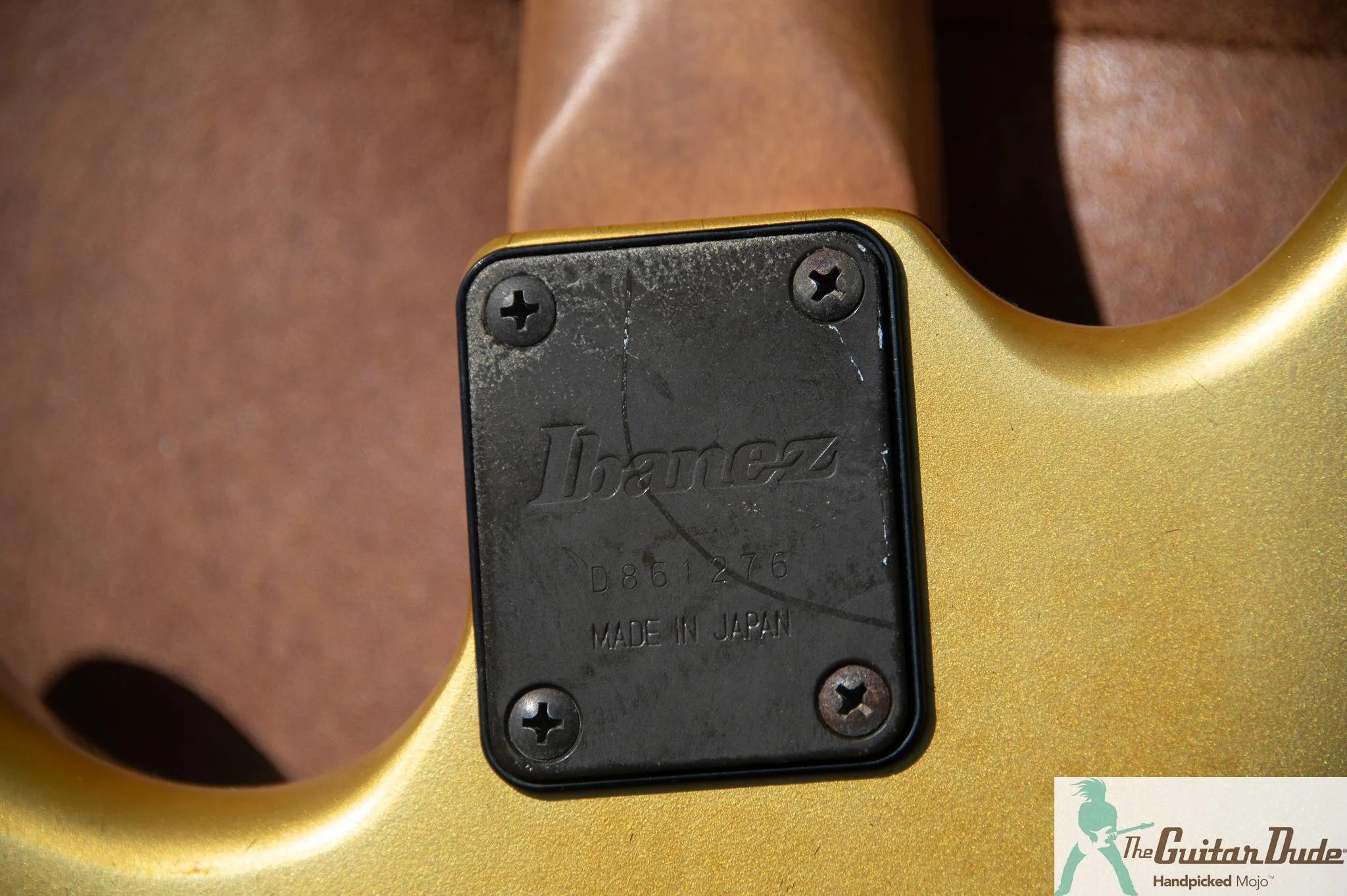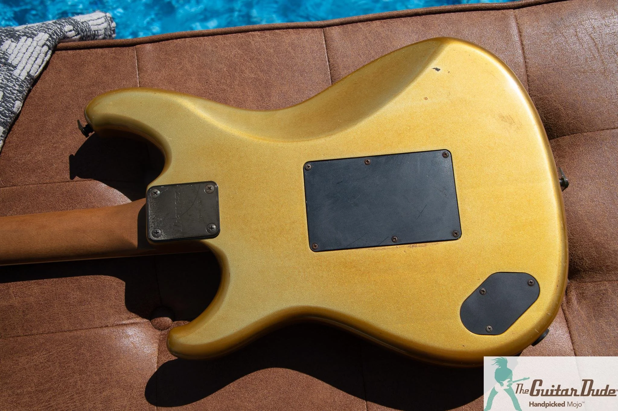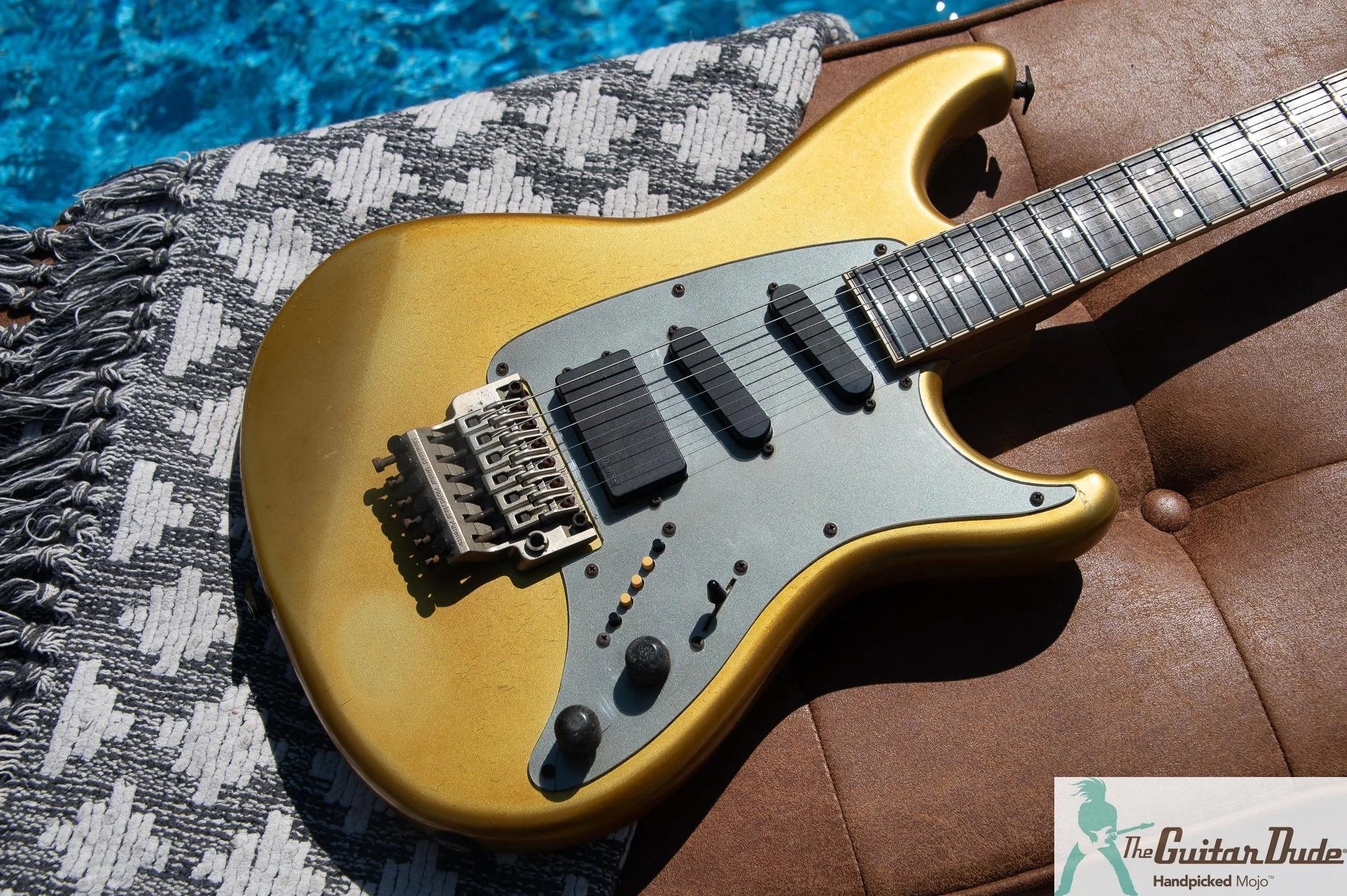 Picture this: a shimmering Gold Pearl finish that catches light like liquid gold, offset double-cutaway alder body with those sleek, rounded ’80s contours that feel like they were carved for speed. The bolt-on maple neck (the direct ancestor of the legendary Wizard profile) is slim, fast, and buttery-smooth – 22 jumbo frets on a bound ebony fingerboard with classy abalone dots that pop against the dark wood. It’s the kind of neck that makes you want to rip up and down the fretboard for hours.