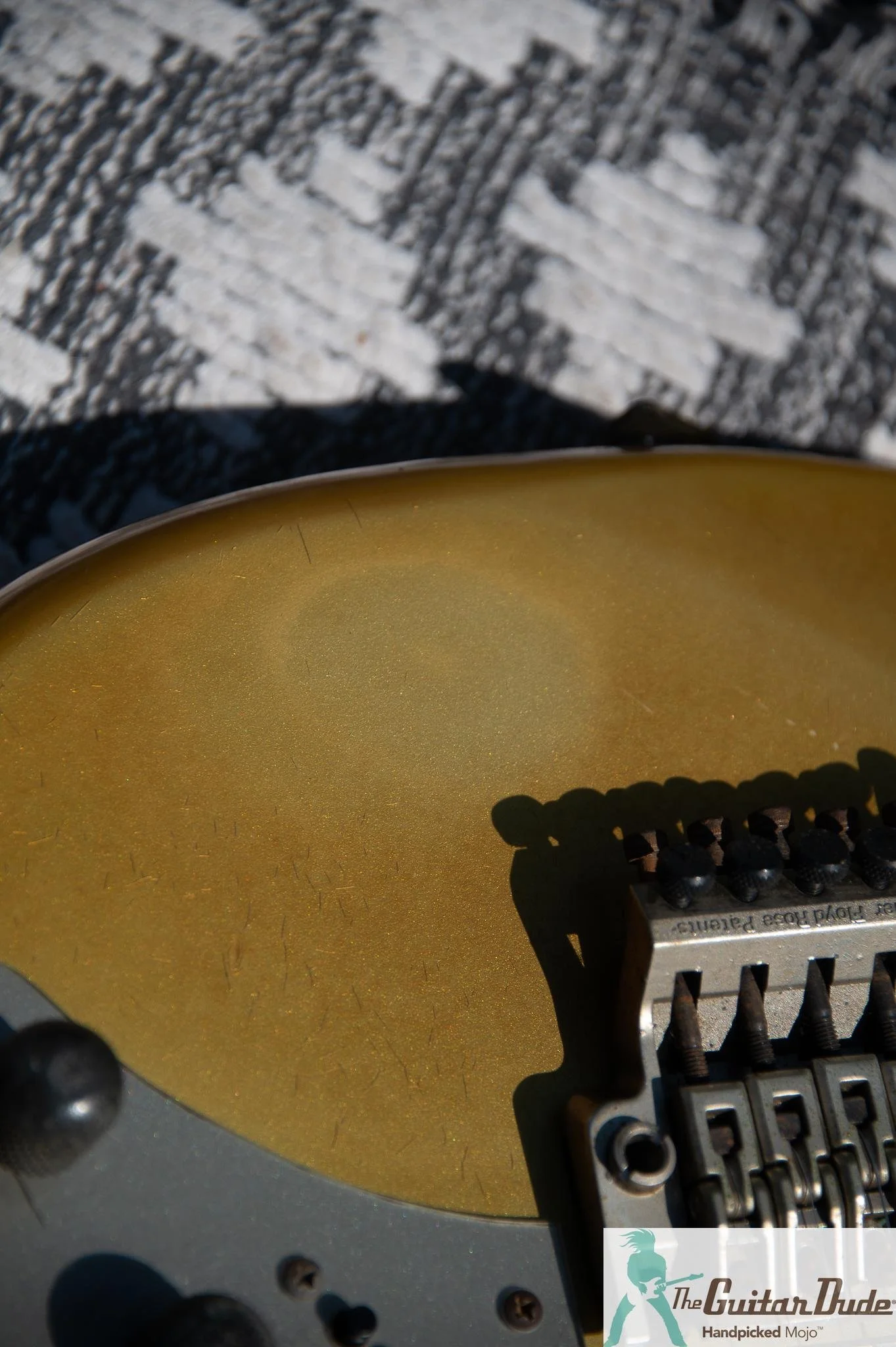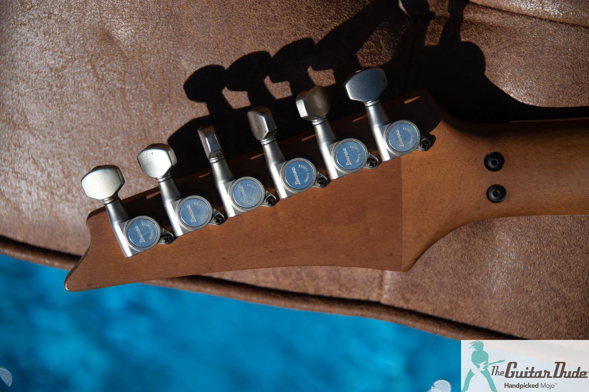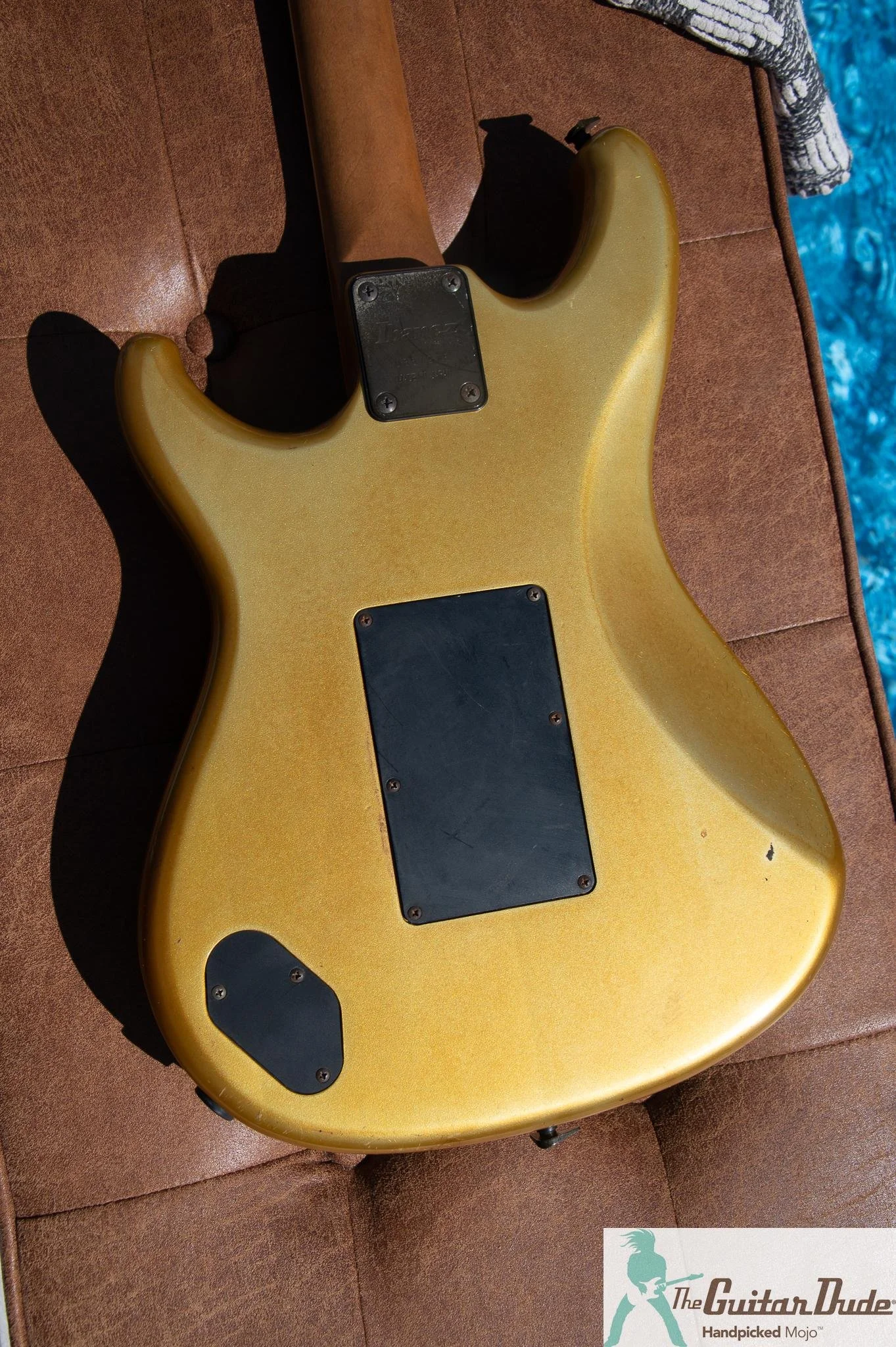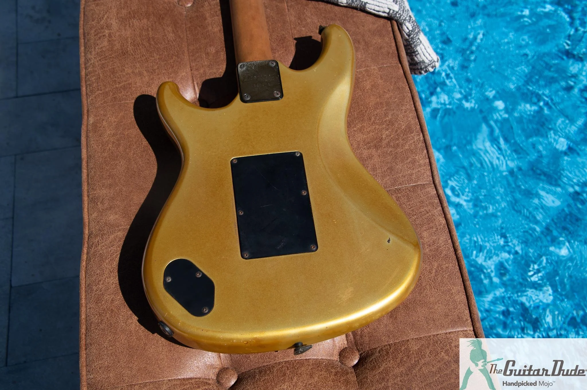 Picture this: a shimmering Gold Pearl finish that catches light like liquid gold, offset double-cutaway alder body with those sleek, rounded ’80s contours that feel like they were carved for speed. The bolt-on maple neck (the direct ancestor of the legendary Wizard profile) is slim, fast, and buttery-smooth – 22 jumbo frets on a bound ebony fingerboard with classy abalone dots that pop against the dark wood. It’s the kind of neck that makes you want to rip up and down the fretboard for hours.