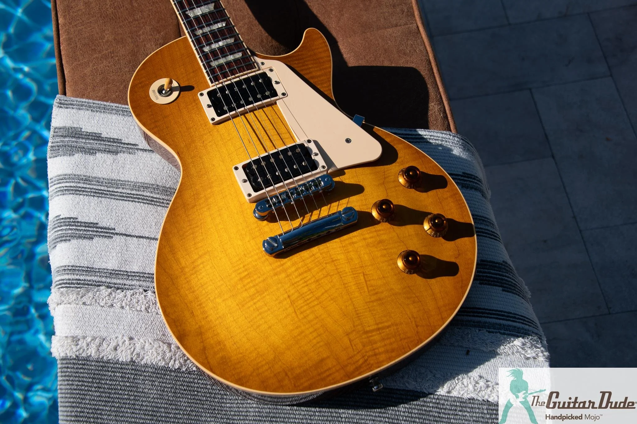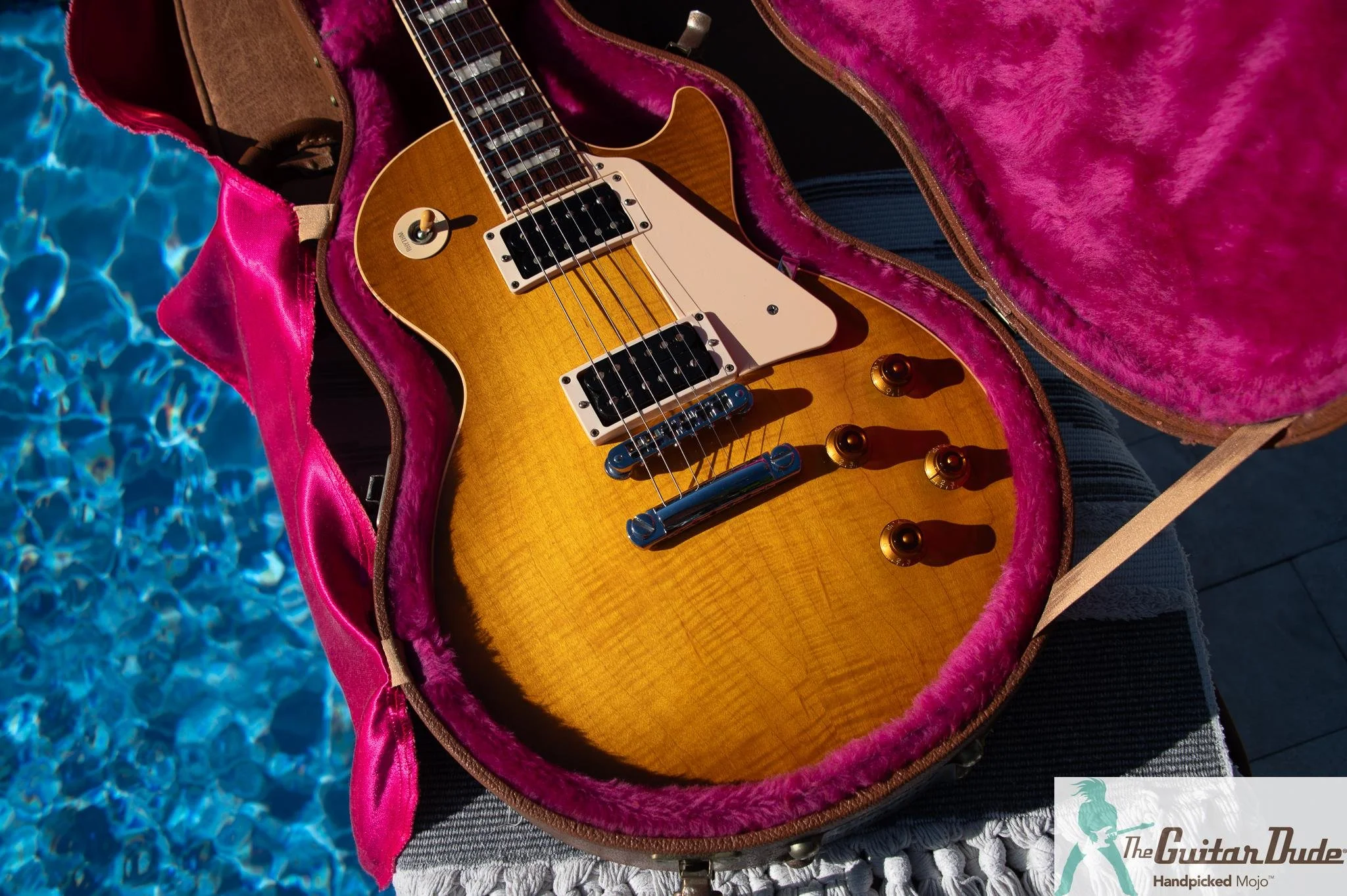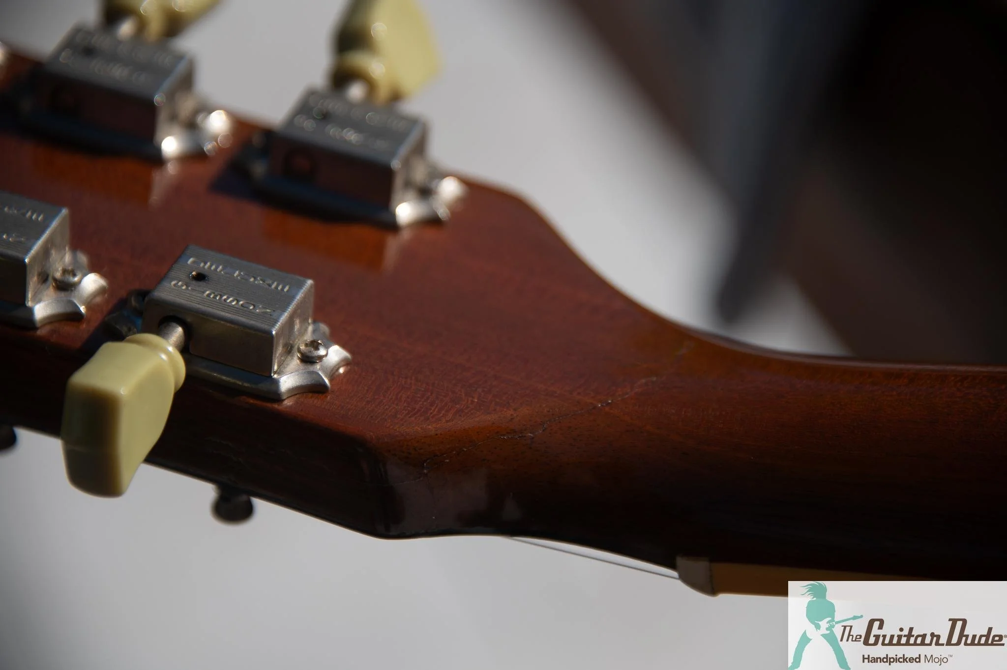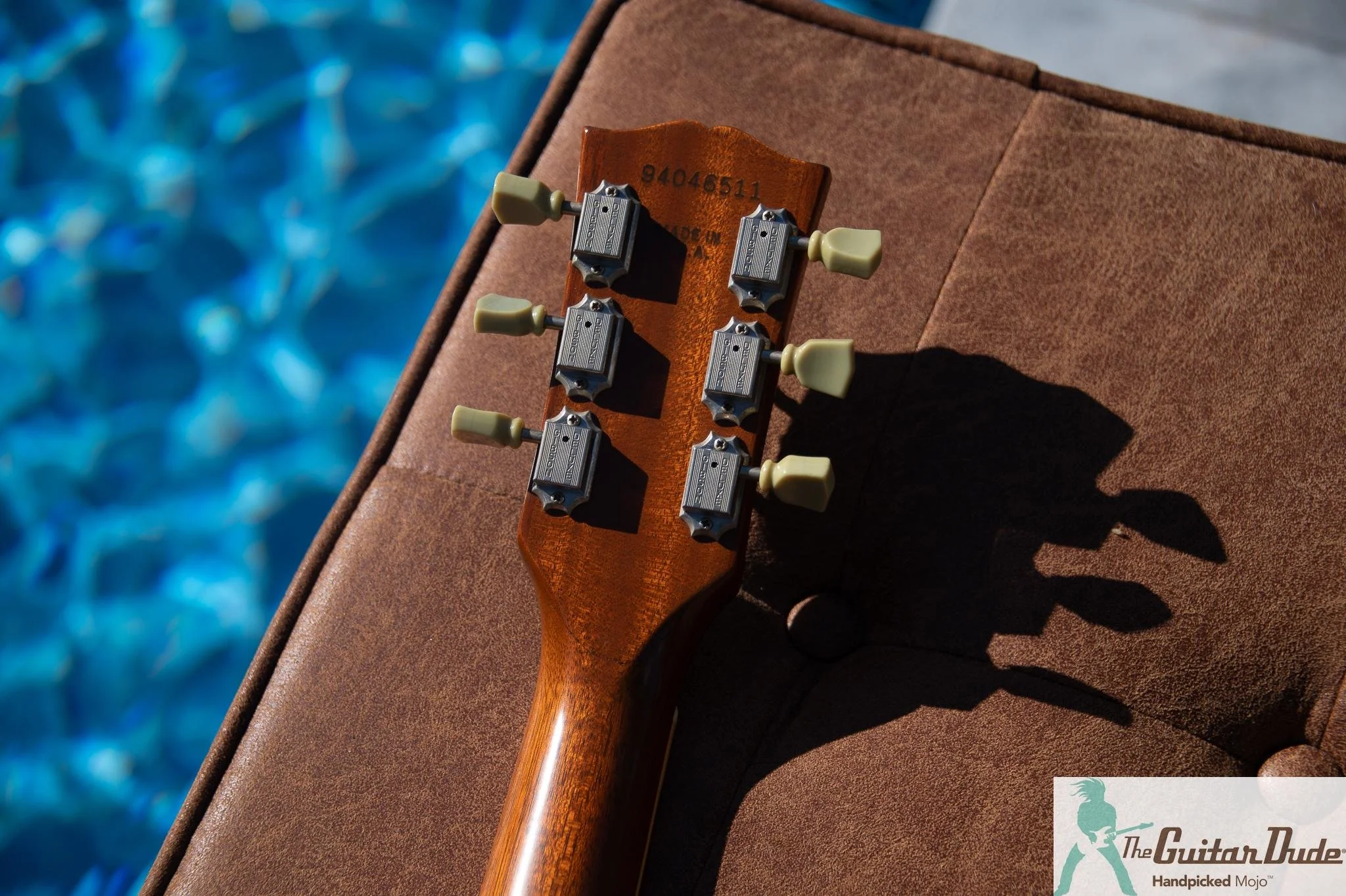 The star of the show is the beautiful vintage-correct flamed maple top featuring subtle, tight tiger-stripe flames that dance elegantly under the translucent Honey Burst nitro. It’s classy, not flashy — exactly the kind of figured top that made ’90s Gibsons special.