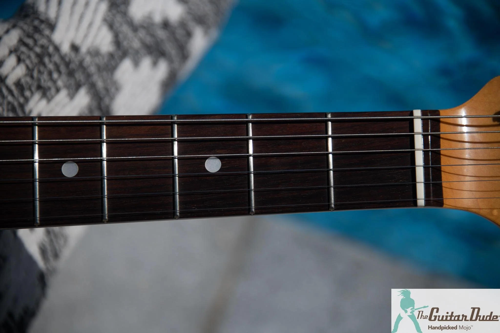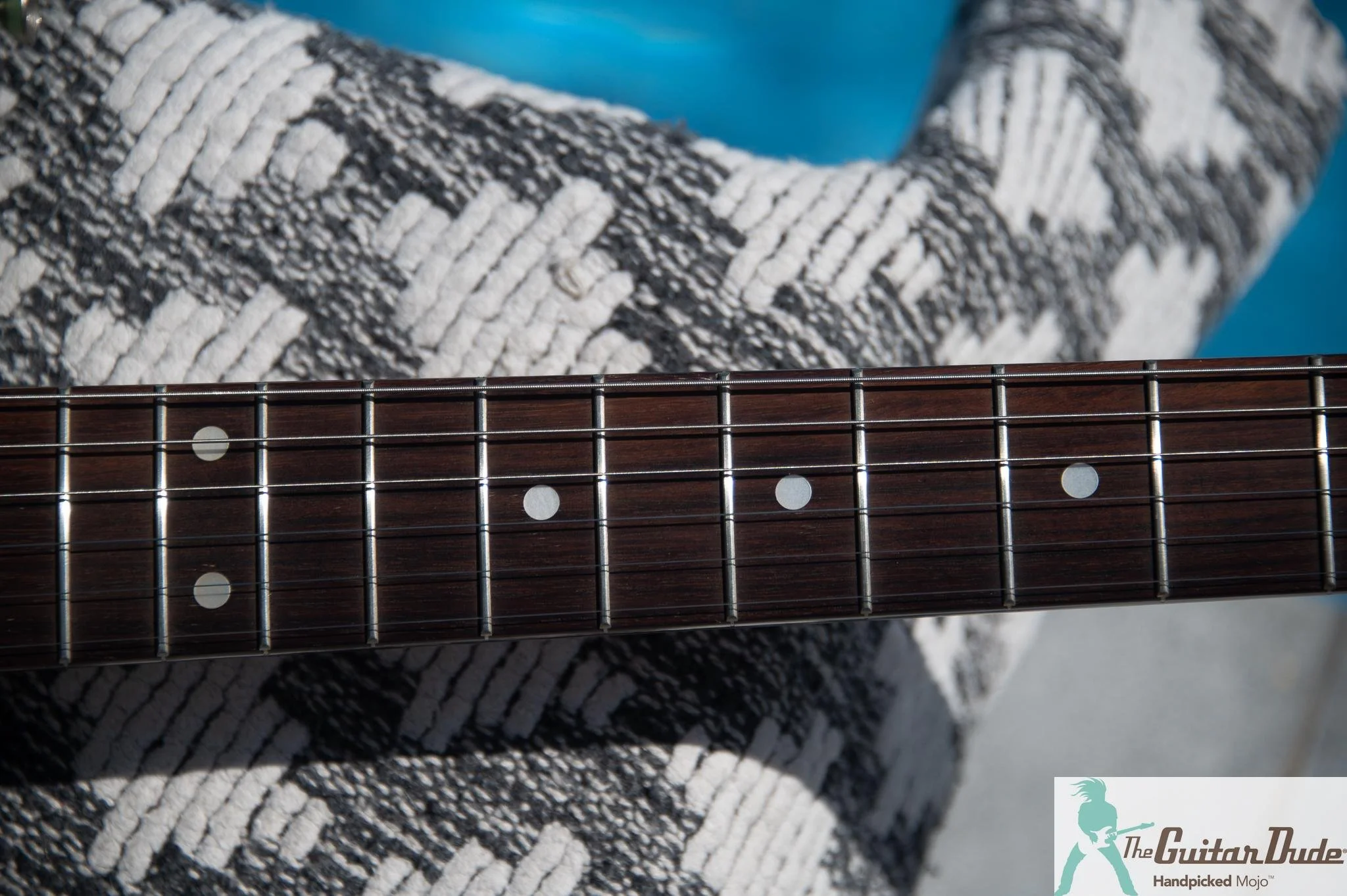 This guitar is professionally set up and dialed in for optimal tone and playability. It has low action with no buzzing or dead spots and is an absolute joy to play. It has been deep cleaned and detailed. All guitars will arrive looking and playing great. The frets have been leveled / dressed / polished and the fingerboard was cleaned. (Unfinished Rosewood and Ebony boards get treated with Fret Doctor - a proprietary all natural oil that is the best on the market) It has brand new strings, the action was adjusted, the intonation is spot on and it plays excellent. All the electronics work flawlessly.