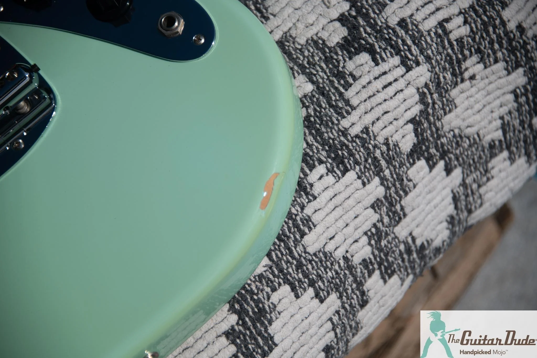 Hey, tone chasers and riff rebels! Step into the spotlight with this super sweet Fender '69 Mustang reissue, draped in a cool and properly aged Sonic Blue finish that screams retro cool. Originally launched as a starter axe back in the day, the Mustang quickly galloped into legend status, captivating players and pros alike with its jangly punch and unbeatable workhorse vibe. Over the decades, it's built a fanatical cult following – and once you plug in, you'll get why. That short scale neck delivers effortless playability, while the simple yet versatile electronics adapt like a chameleon to any genre, cranking out stellar sounds in rock, punk, emo, surf-rock, country, jazz, or whatever sonic adventure you throw its way. Wether chasing surf rock nostalgia or Grunge era grooves.. this sweet little piece delivers in buckets.