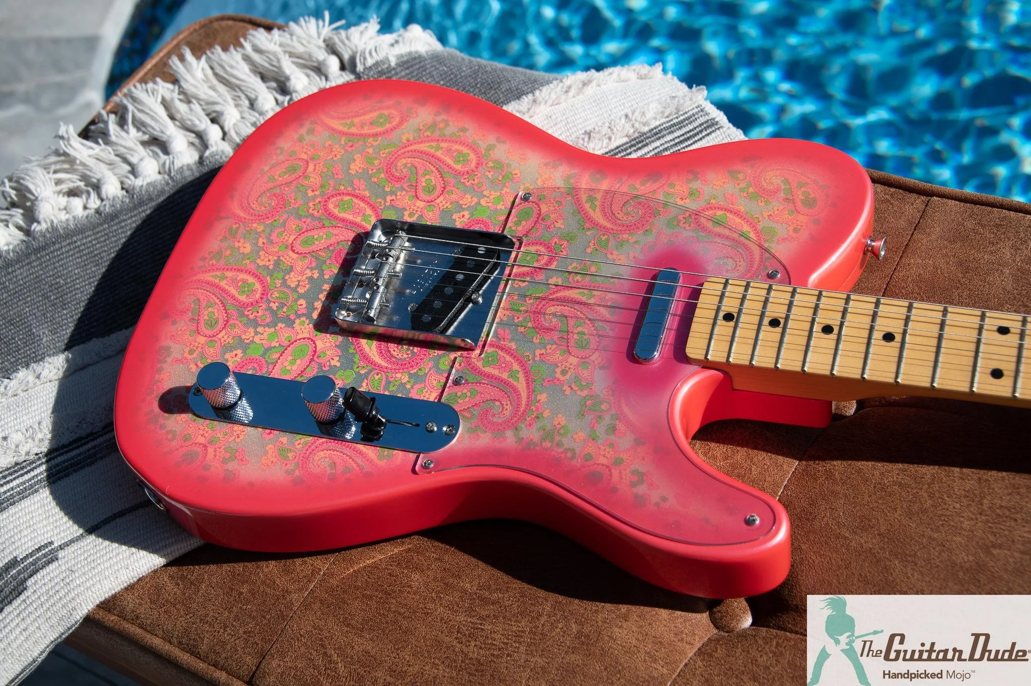 Stunning Visuals That Turn Heads: Picture this – a lightweight basswood body cloaked in vibrant pink paisley wallpaper, evoking the flower-power era with hypnotic floral swirls in shades of rose, crimson, and subtle gold accents. The finish is flawless, with no fading, chips, or dings to speak of – just that eye-popping, factory-fresh sheen under stage lights or in your display case. Paired with a sleek maple neck featuring a comfortable "C" profile, rosewood fretboard, and 21 vintage-style frets that feel buttery smooth under your fingers. Chrome hardware gleams like new, from the classic 3-saddle bridge to the knurled control knobs, all screaming retro cool without a hint of wear.