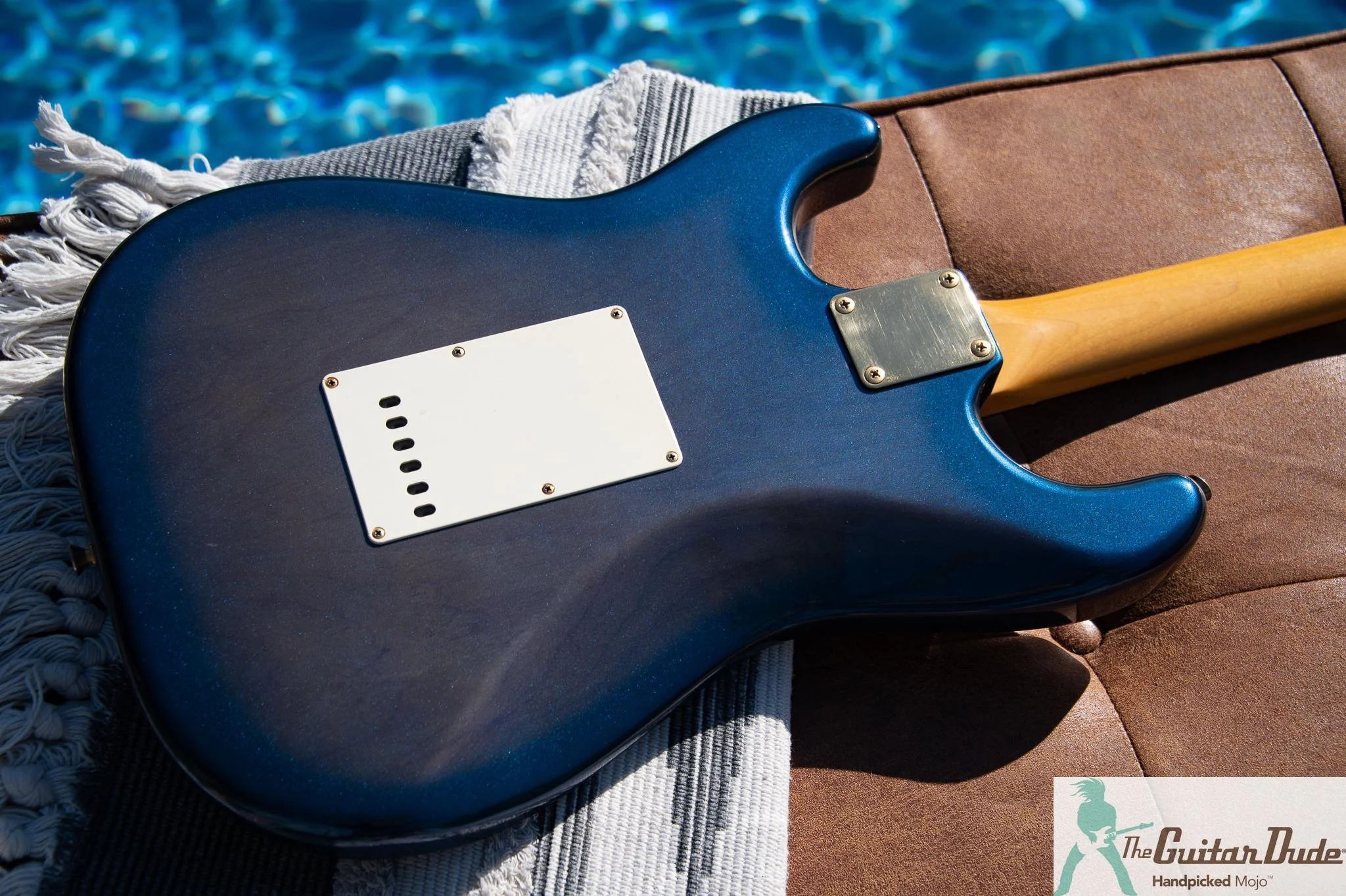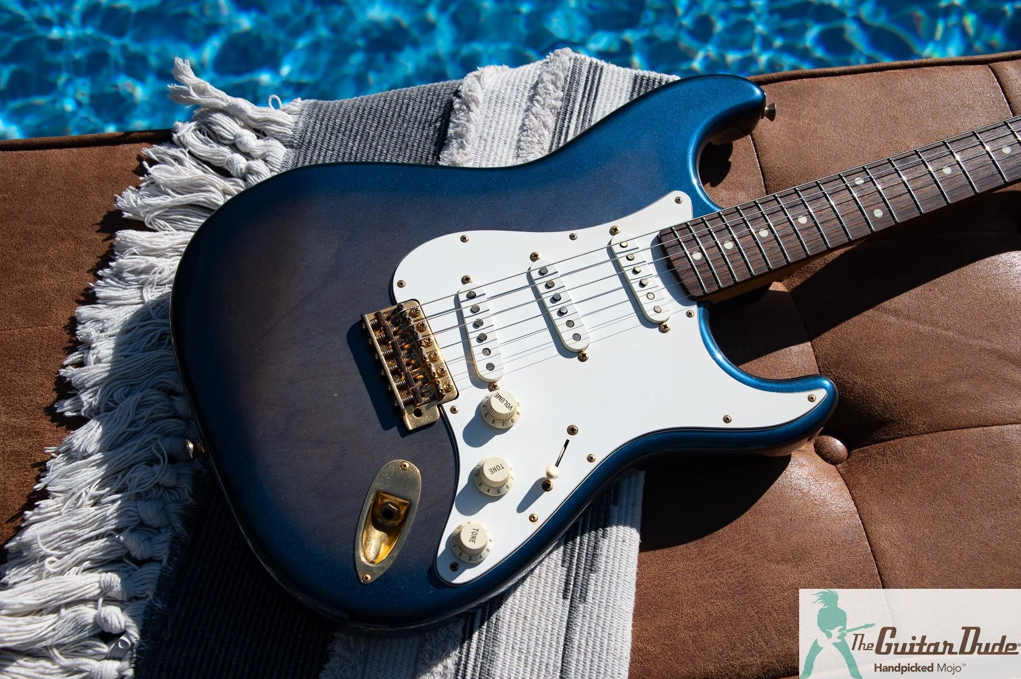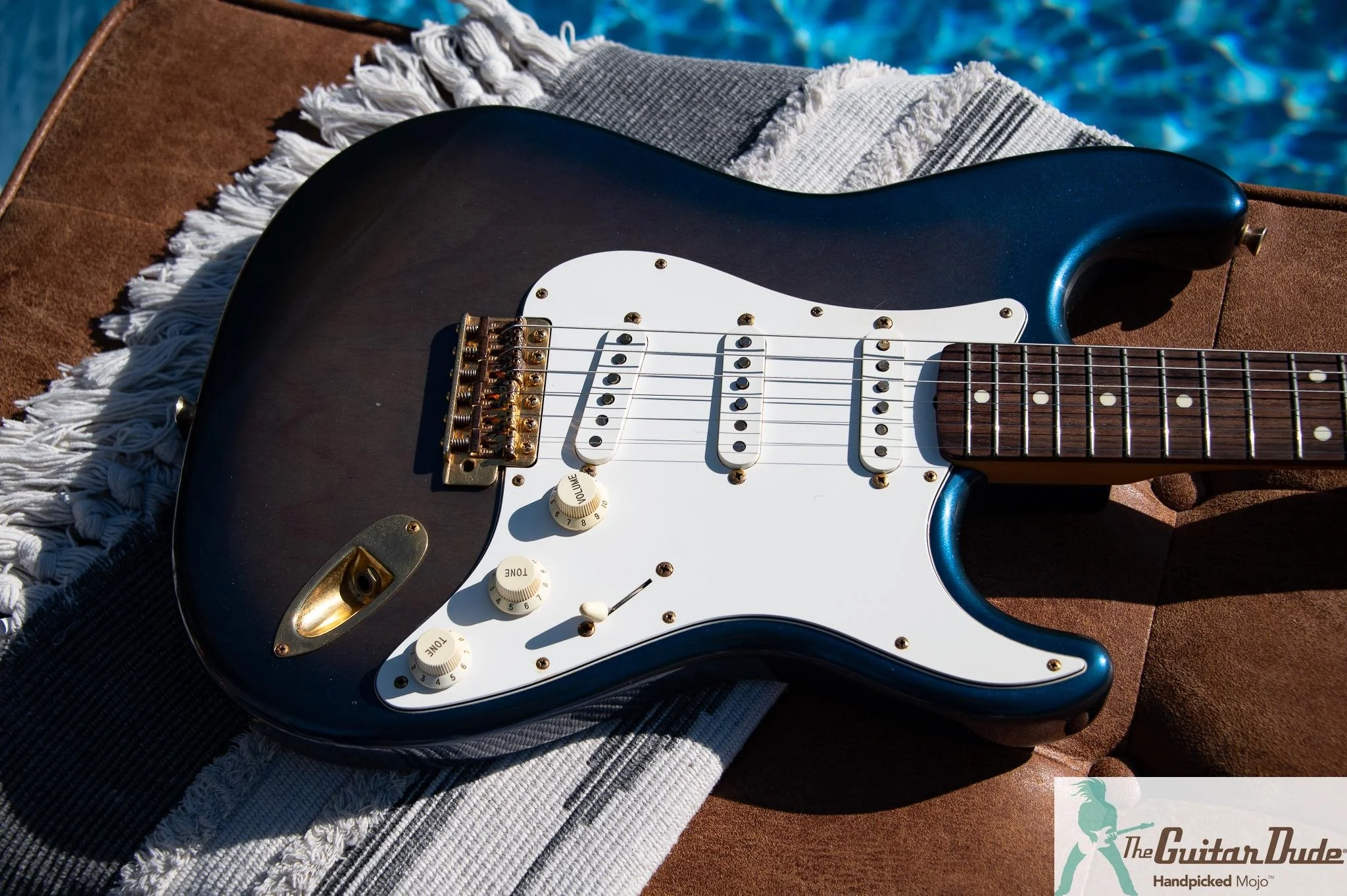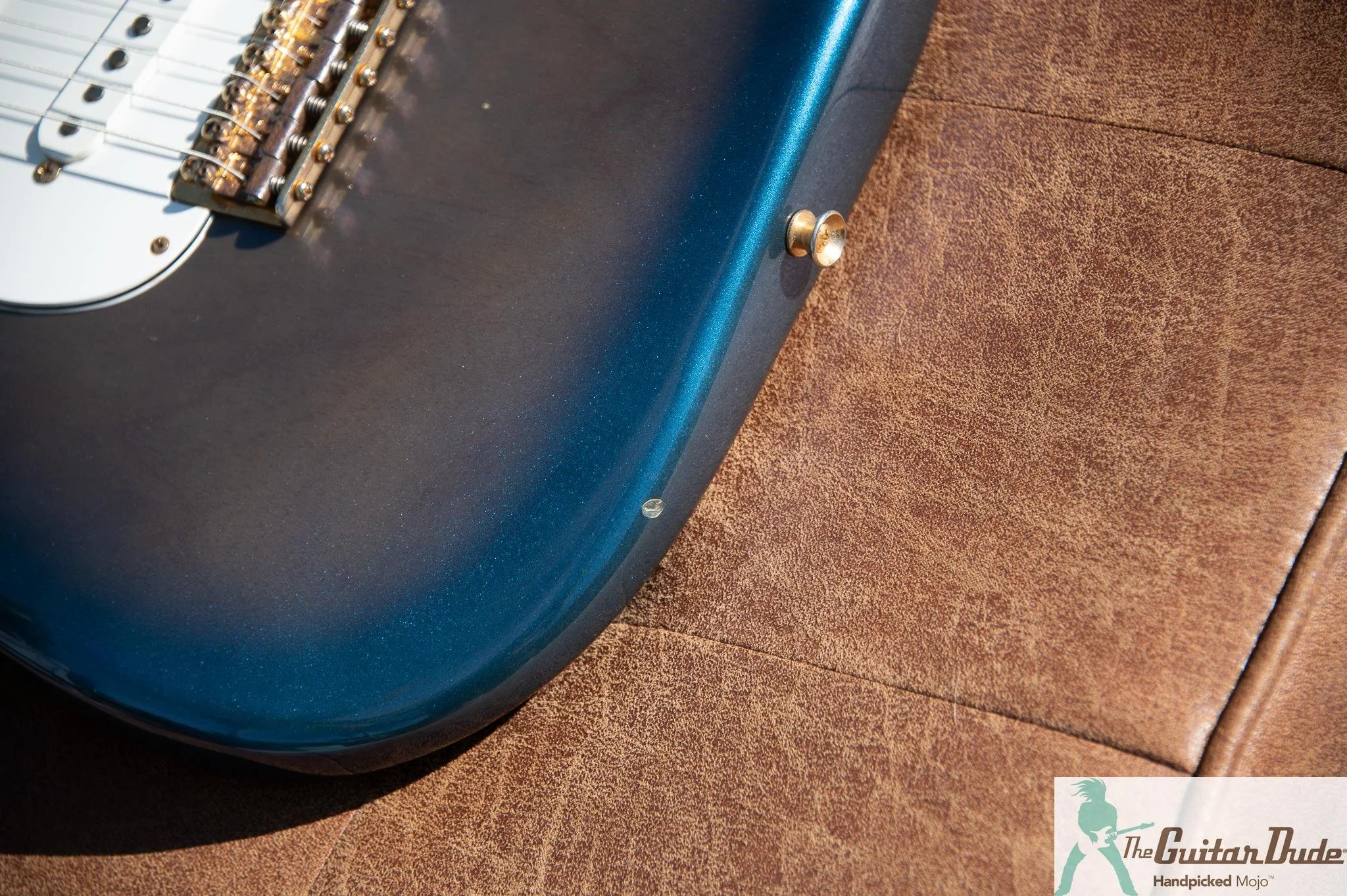 At nearly 23 years young, this gem defies time with its very good to excellent cosmetic condition – just a whisper of minor dings, dents, and a subtle chip along the bottom edge (check the pics for proof of its well-preserved allure). But oh, the visuals! Dive into the hypnotic Blue Baltic Vintage finish draped over a solid ash body: a breathtaking transparent blue burst that dances across the exquisite wood grain, seamlessly fading into an opaque blue haze laced with shimmering metalflake at the edges. Watch in awe as the color shifts magically from solid opacity to ethereal translucency based on the viewing angle – a chameleon-like effect that's pure optical wizardry. Paired with a crisp three-ply white pickguard and gleaming gold hardware, this Strat exudes timeless elegance and rock-star charisma, turning heads wherever it goes.