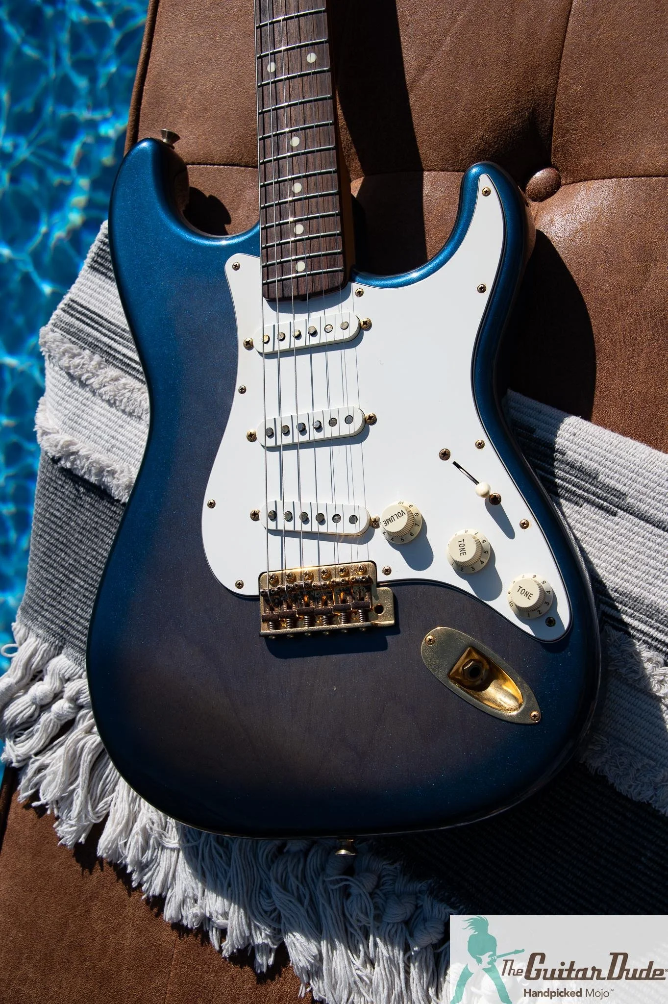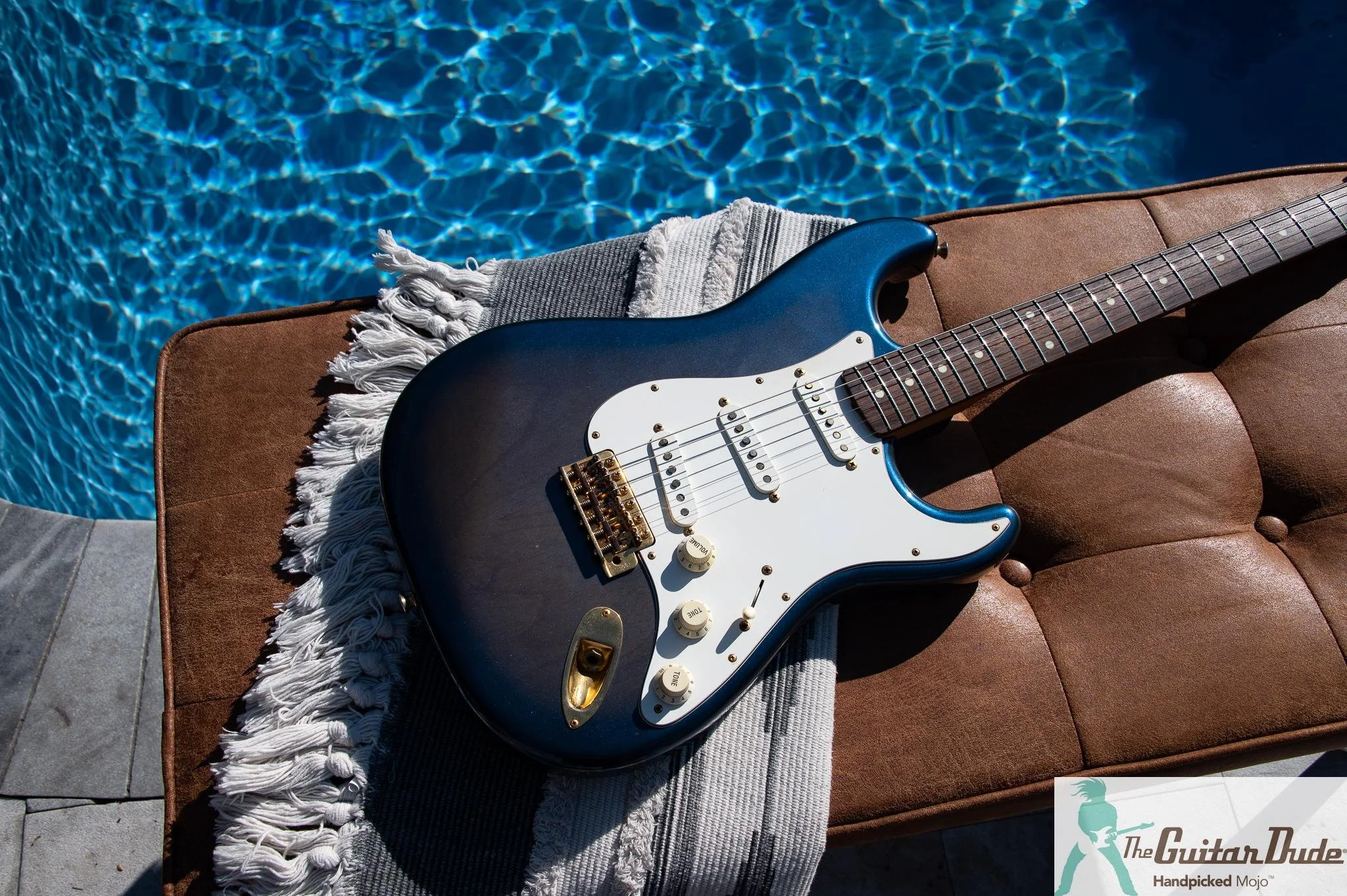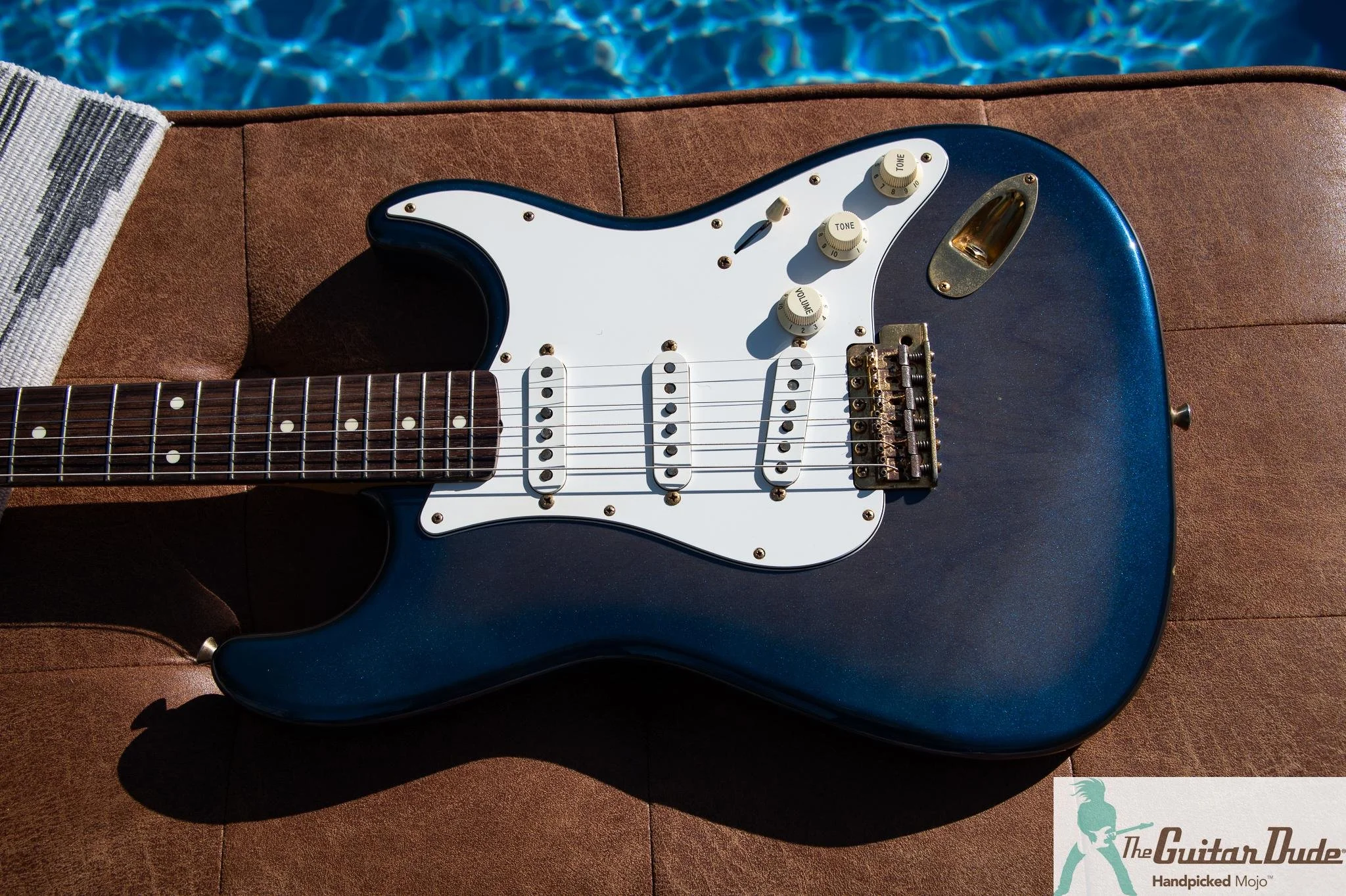 At nearly 23 years young, this gem defies time with its very good to excellent cosmetic condition – just a whisper of minor dings, dents, and a subtle chip along the bottom edge (check the pics for proof of its well-preserved allure). But oh, the visuals! Dive into the hypnotic Blue Baltic Vintage finish draped over a solid ash body: a breathtaking transparent blue burst that dances across the exquisite wood grain, seamlessly fading into an opaque blue haze laced with shimmering metalflake at the edges. Watch in awe as the color shifts magically from solid opacity to ethereal translucency based on the viewing angle – a chameleon-like effect that's pure optical wizardry. Paired with a crisp three-ply white pickguard and gleaming gold hardware, this Strat exudes timeless elegance and rock-star charisma, turning heads wherever it goes.