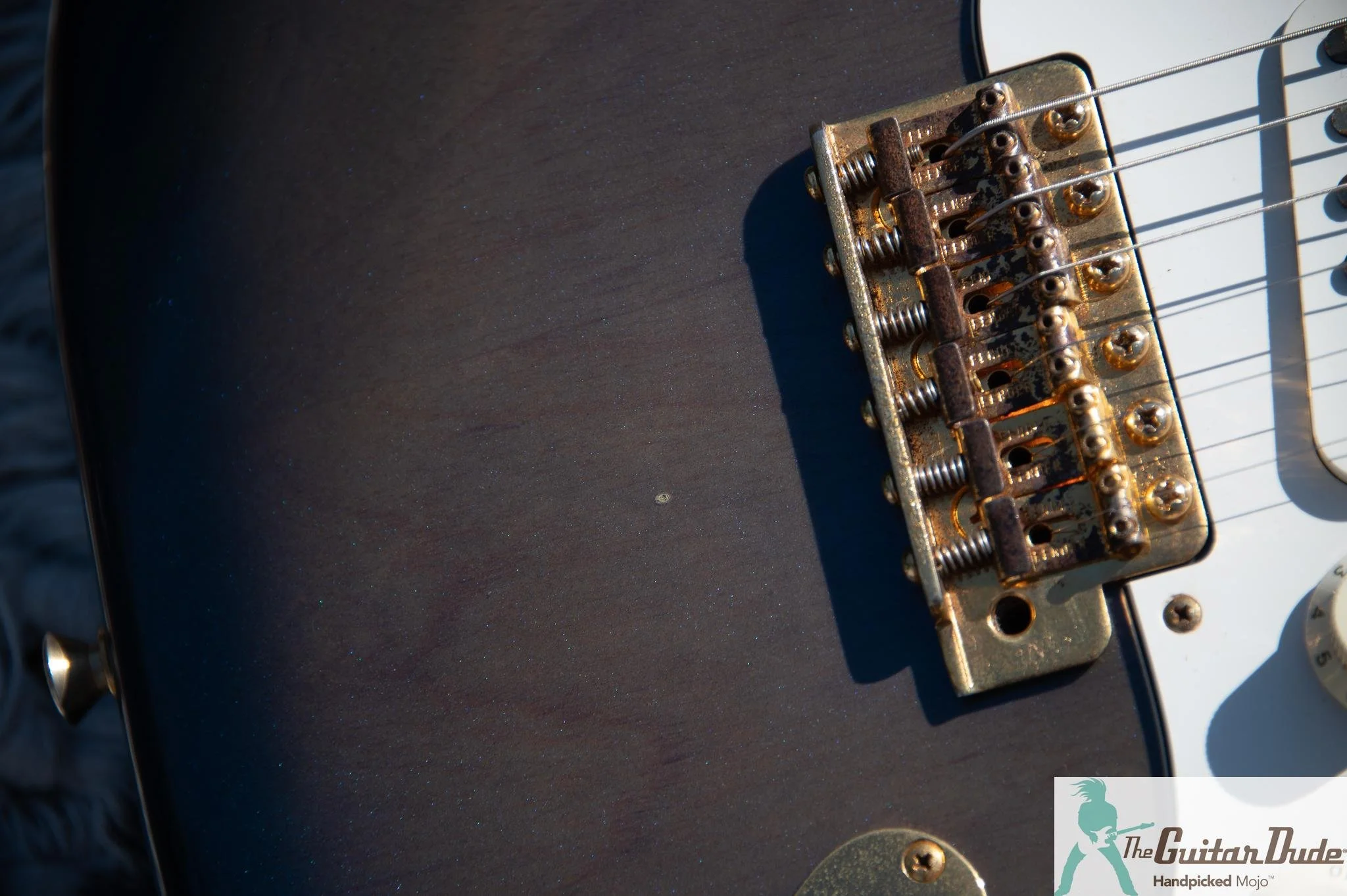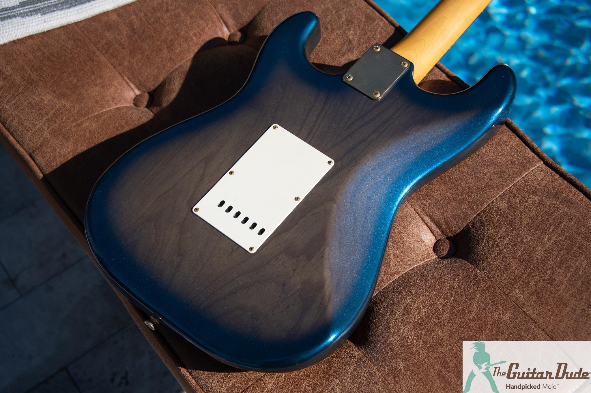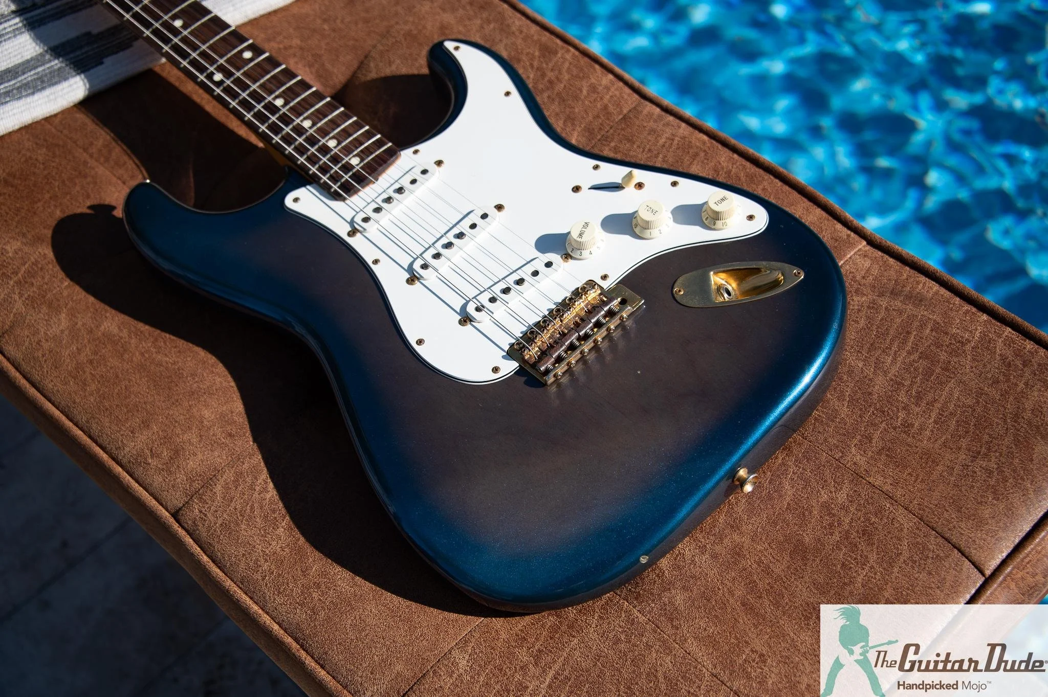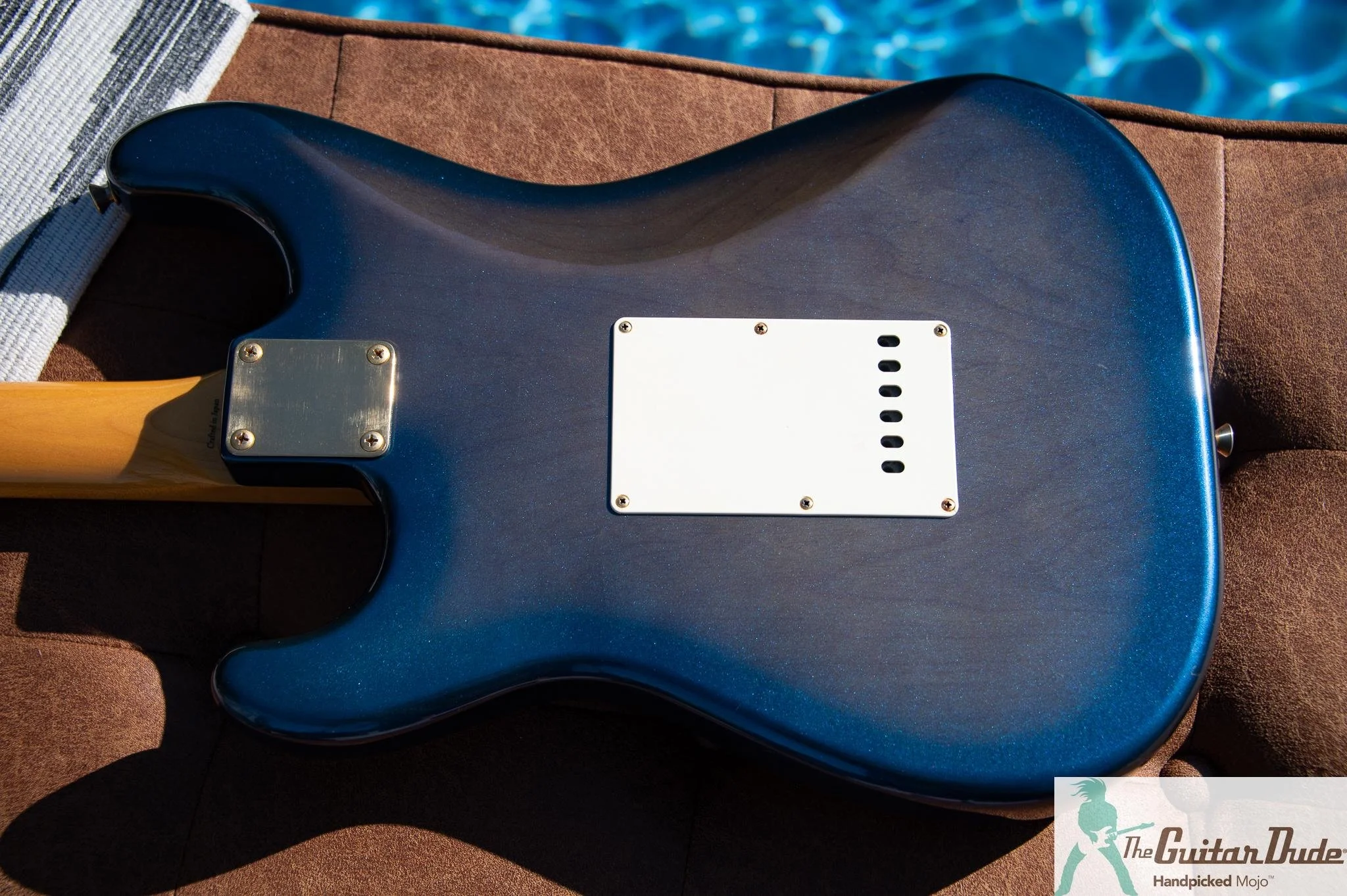 At nearly 23 years young, this gem defies time with its very good to excellent cosmetic condition – just a whisper of minor dings, dents, and a subtle chip along the bottom edge (check the pics for proof of its well-preserved allure). But oh, the visuals! Dive into the hypnotic Blue Baltic Vintage finish draped over a solid ash body: a breathtaking transparent blue burst that dances across the exquisite wood grain, seamlessly fading into an opaque blue haze laced with shimmering metalflake at the edges. Watch in awe as the color shifts magically from solid opacity to ethereal translucency based on the viewing angle – a chameleon-like effect that's pure optical wizardry. Paired with a crisp three-ply white pickguard and gleaming gold hardware, this Strat exudes timeless elegance and rock-star charisma, turning heads wherever it goes.
