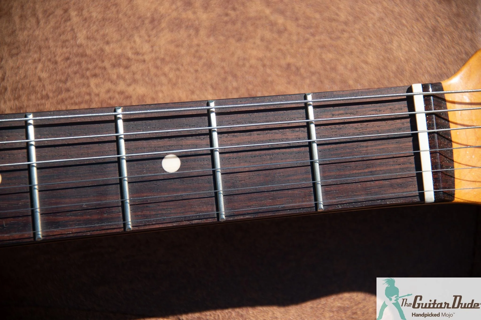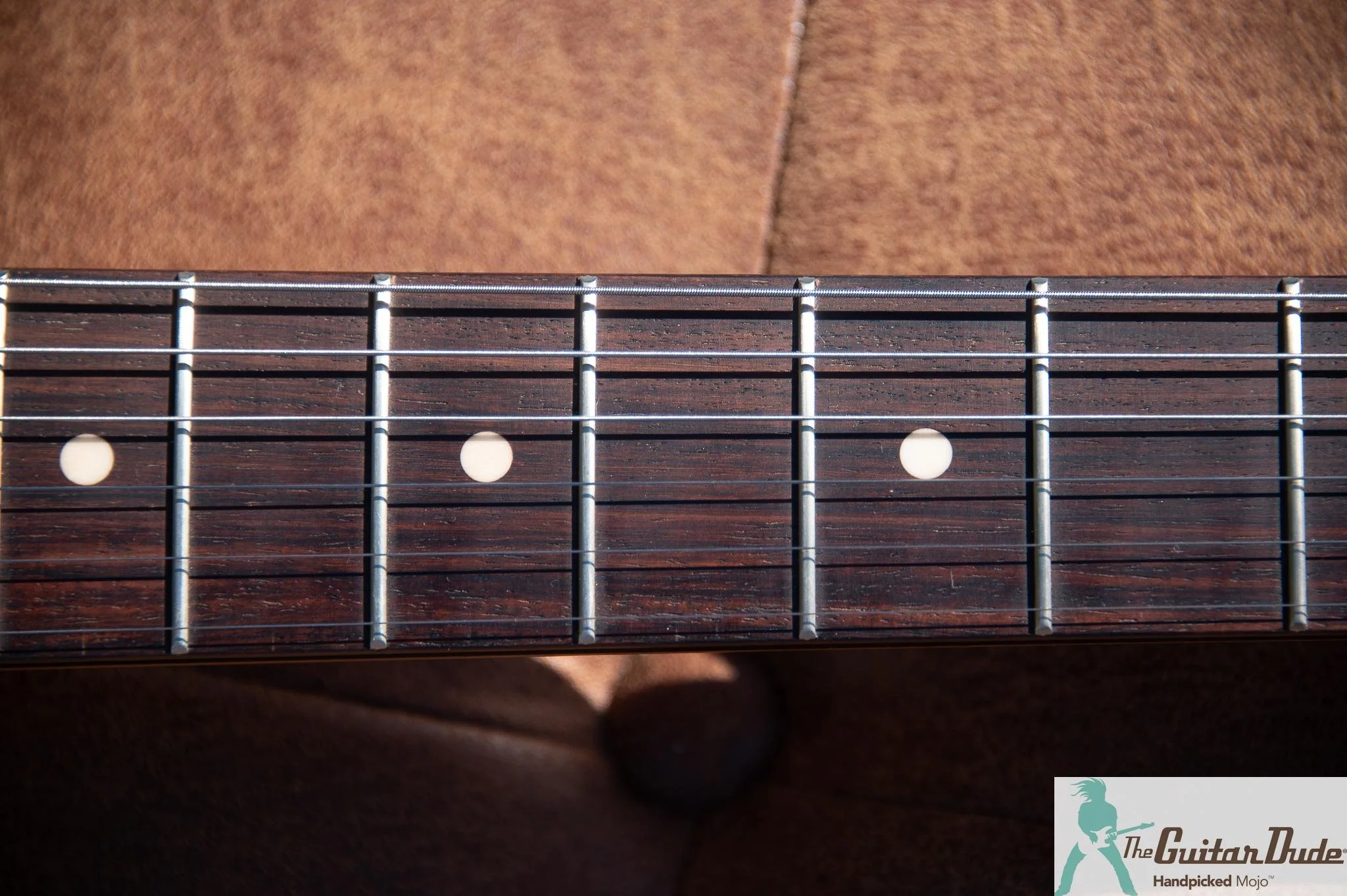 This guitar is professionally set up and dialed in for optimal tone and playability. It has low action with no buzzing or dead spots and is an absolute joy to play. It has been deep cleaned and detailed. All guitars will arrive looking and playing great. The frets have been leveled / dressed / polished and the fingerboard was cleaned. (Unfinished Rosewood and Ebony boards get treated with Fret Doctor - a proprietary all natural oil that is the best on the market) It has brand new strings, the action was adjusted, the intonation is spot on and it plays excellent. All the electronics work flawlessly.