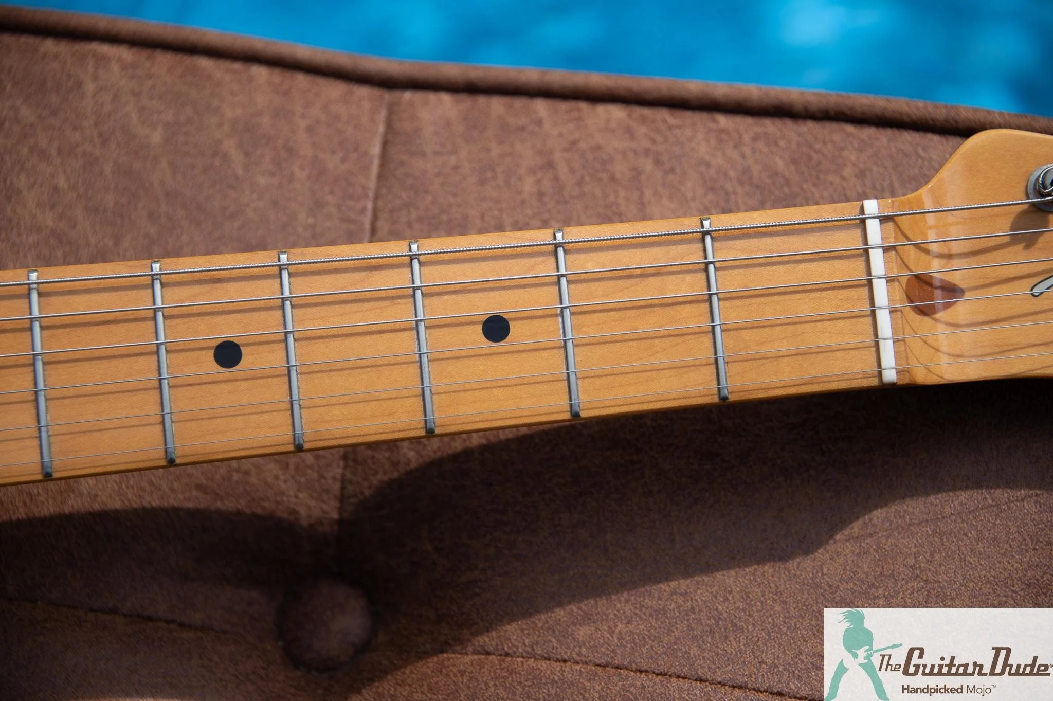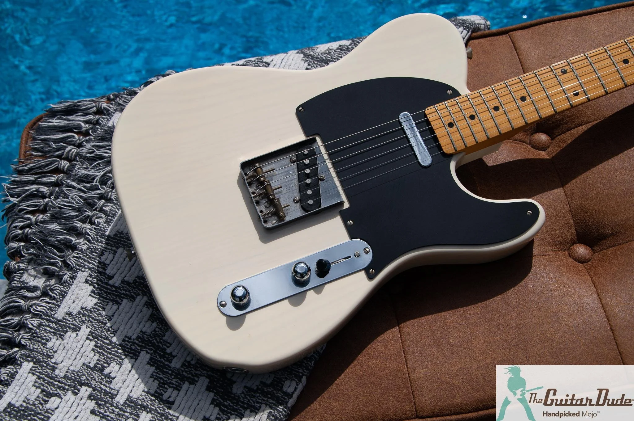 From the very first second you sling it on, the premium ash body sings with that unmistakable resonant snap and sustain only the finest swamp ash delivers. Finished in that ultra-rare US Blonde — a deep, creamy, vintage-correct color that lets the precious grain peek through & glows under the lights like it was pulled straight from a 1950s Fender catalog. The soft V neck profile is pure butter: comfortable, fast, and instantly familiar, with just the right amount of vintage chunk without any sharp edges. It melts into your hand and begs you to play for hours.