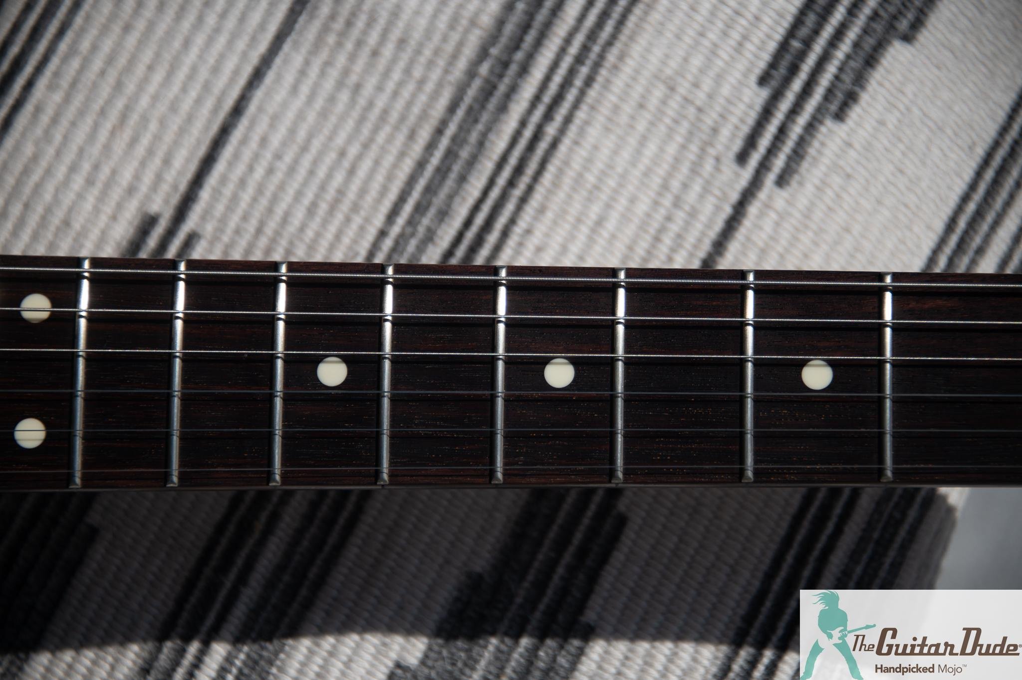 This guitar is professionally set up and dialed in for optimal tone and playability. It has low action with no buzzing or dead spots and is an absolute joy to play. It has been deep cleaned and detailed. All guitars will arrive looking and playing great. The frets have been leveled / dressed / polished and the fingerboard was cleaned. (Unfinished Rosewood and Ebony boards get treated with Fret Doctor - a proprietary all natural oil that is the best on the market) It has brand new strings, the action was adjusted, the intonation is spot on and it plays excellent. All the electronics work flawlessly.