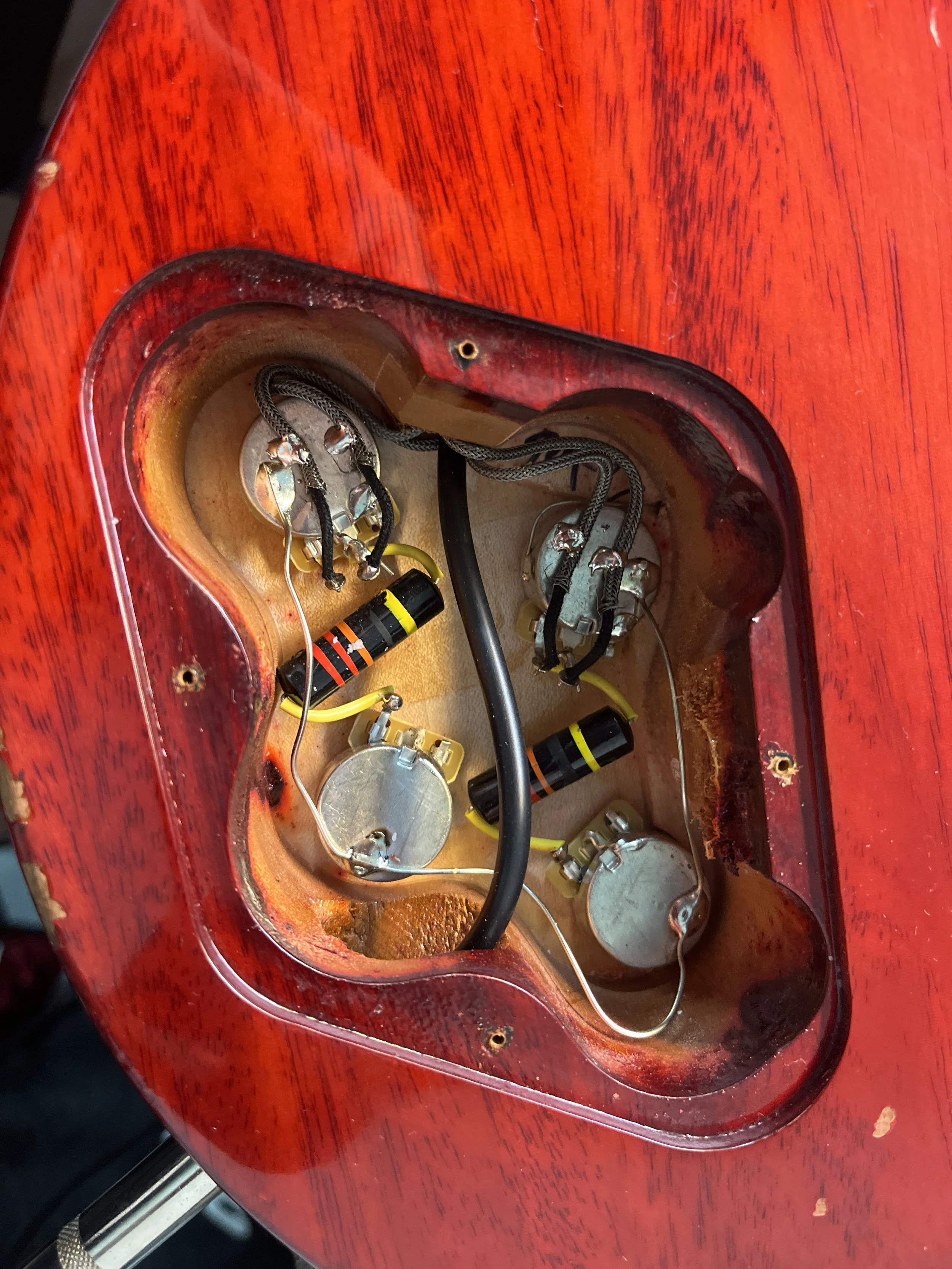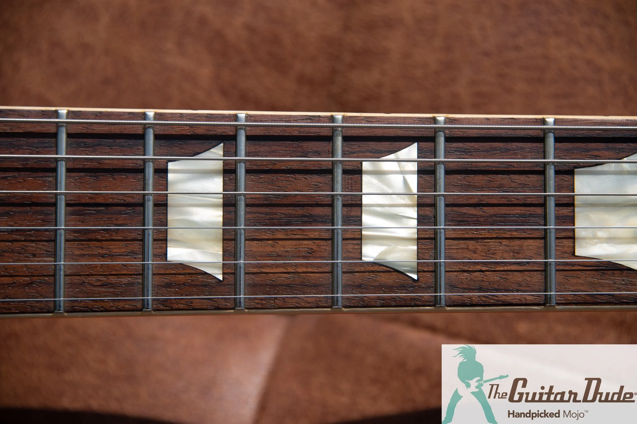 It has just been deep cleaned and detailed. The frets were dressed/polished and the fingerboard was cleaned. (Unfinished Rosewood and Ebony boards get treated with the magical Fret Doctor- a proprietary oil that is the best on the market) It was professionally set up and has brand new strings, the action was adjusted and it plays excellent. All the electronics work as they should.
