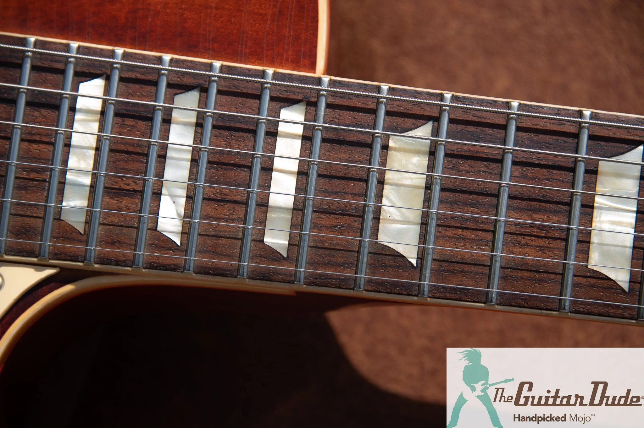 This piece was especially made for the Japanese Domestic Market and was shipped to Japan right after production. It has been collector owned and unplayed, so it is in pretty much mint condition. It has an incredible, vintage correct flamed maple top that has tons of character and is not over the top. It actually looks like a real burst. The first thing you notice is the very nice Murphy-spec rounded 50's neck shape. Without question the neck on this guitar is one of the best and most accurate I have ever played. It's nearly identical to the neck of my vintage 1958 Les Paul Junior single-cut, maybe even nicer. It fits my hand like a glove, very comfortable. The pale white neck binding is gently rolled and the frets are a nice medium size, not to big, and not too small. The Murphy-spec top carve doesn't play second fiddle to the neck. The guitar's maple top carve has the quintessential dish shape of a '50s Les Paul, unlike any other Gibson Historic Les Paul I have ever played or owned. Although this guitar is not a "flame monster", the maple top is nonetheless a very nice example of Eastern maple without any annoying mineral streaks or blemishes. I heard somewhere that Tom Murphy selected the wood for the tops, necks, and backs for this special run.