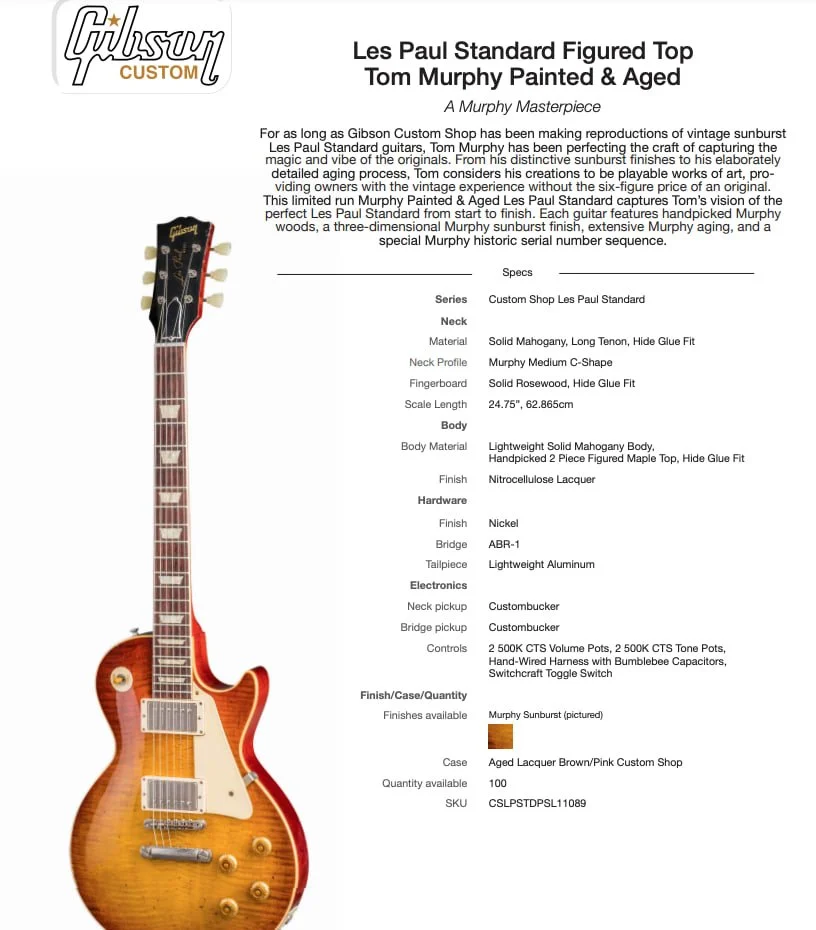 For as long as Gibson Custom Shop has been making reproductions of vintage sunburst Les Paul Standard guitars, Tom Murphy has been perfecting the craft of capturing the magic and vibe of the originals. From his distinctive sunburst finishes to his elaborately detailed aging process, Tom considers his creations to be playable works of art, providing owners with the vintage experience without the six-figure price of an original. This limited run Murphy Painted & Aged Les Paul Standard captures Tom’s vision of the perfect Les Paul Standard from start to finish. Each guitar features handpicked Murphy woods, a three-dimensional Murphy sunburst finish, extensive Murphy aging, and a special Murphy historic serial number sequence. Limited to 100 Pieces