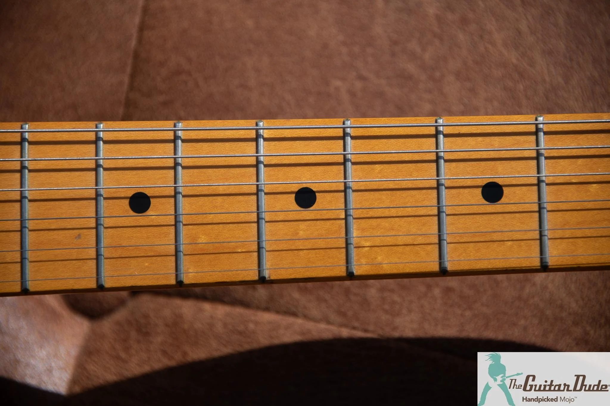 The neck is pure ‘54 magic: a deep Hard V profile that sits perfectly in your hand — substantial, comfortable, and instantly inspiring. It’s the kind of neck players chase for a reason: it locks into your palm, encourages expressive bends, and just feels alive. Frets are clean and smooth, the maple fingerboard has that perfect vintage radius, and the whole neck has that broken-in, played-for-years feel right from the first chord.