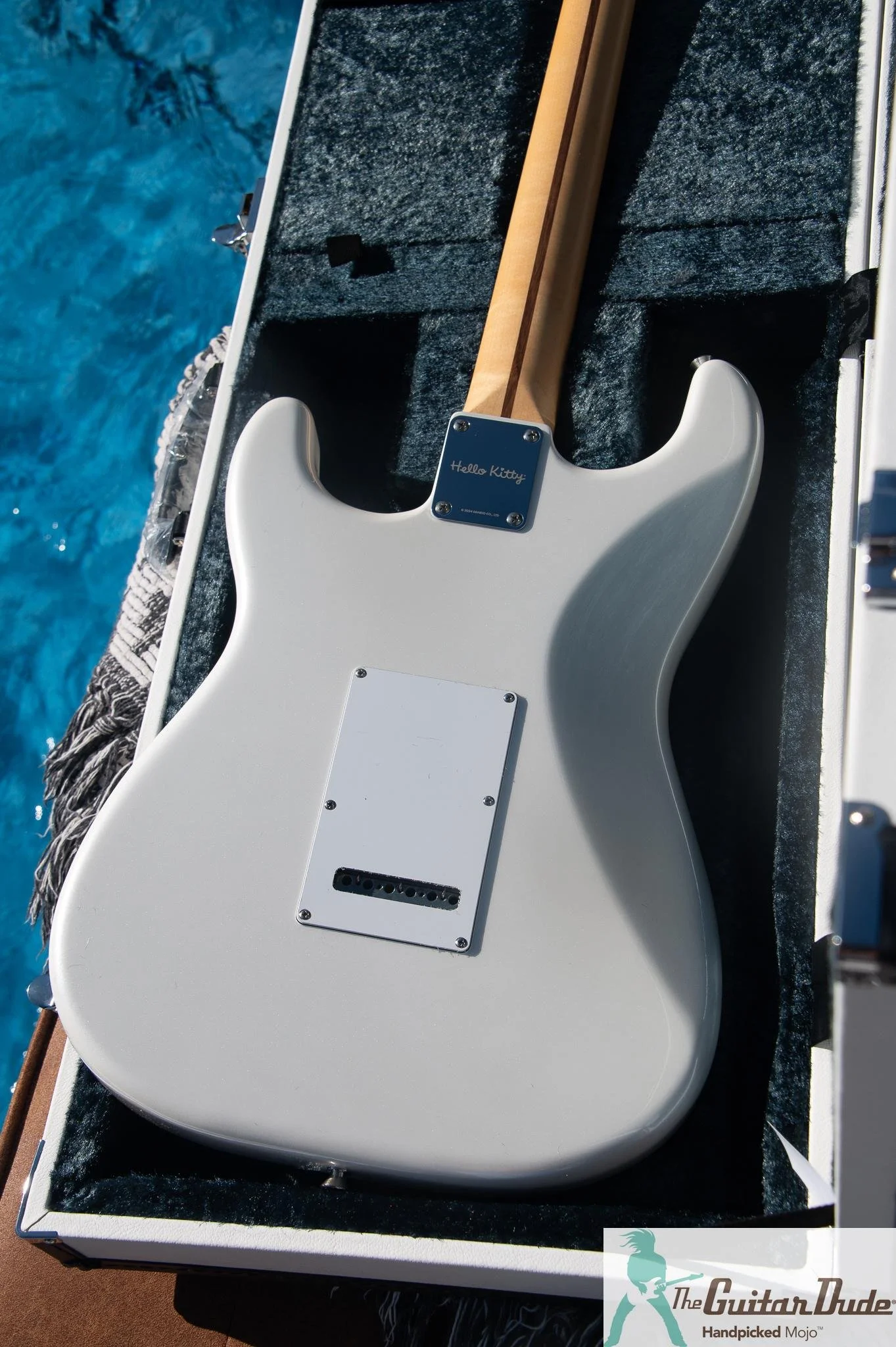 The 2-point synchronized tremolo, vintage-style locking tuners, nickel/chrome hardware, and white control knobs keep every inch pristine and ready to rock. Even the neck plate is engraved with the official Hello Kitty logo and ©2024 SANRIO CO., LTD. — proof of its ultra-exclusive pedigree.