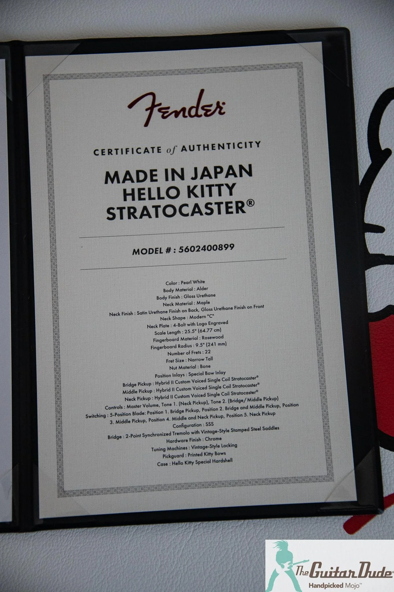 This example is absolutely untouched. Straight from the factory, it’s still wrapped in its original protective plastic on the pickup covers. Never played, never gigged, never even taken out of the case for more than a quick admiring glance. It comes complete with its custom white hardshell case featuring a bold central Hello Kitty design and the official certificate of authenticity—making it the ultimate display piece or the crown jewel of any serious collection.