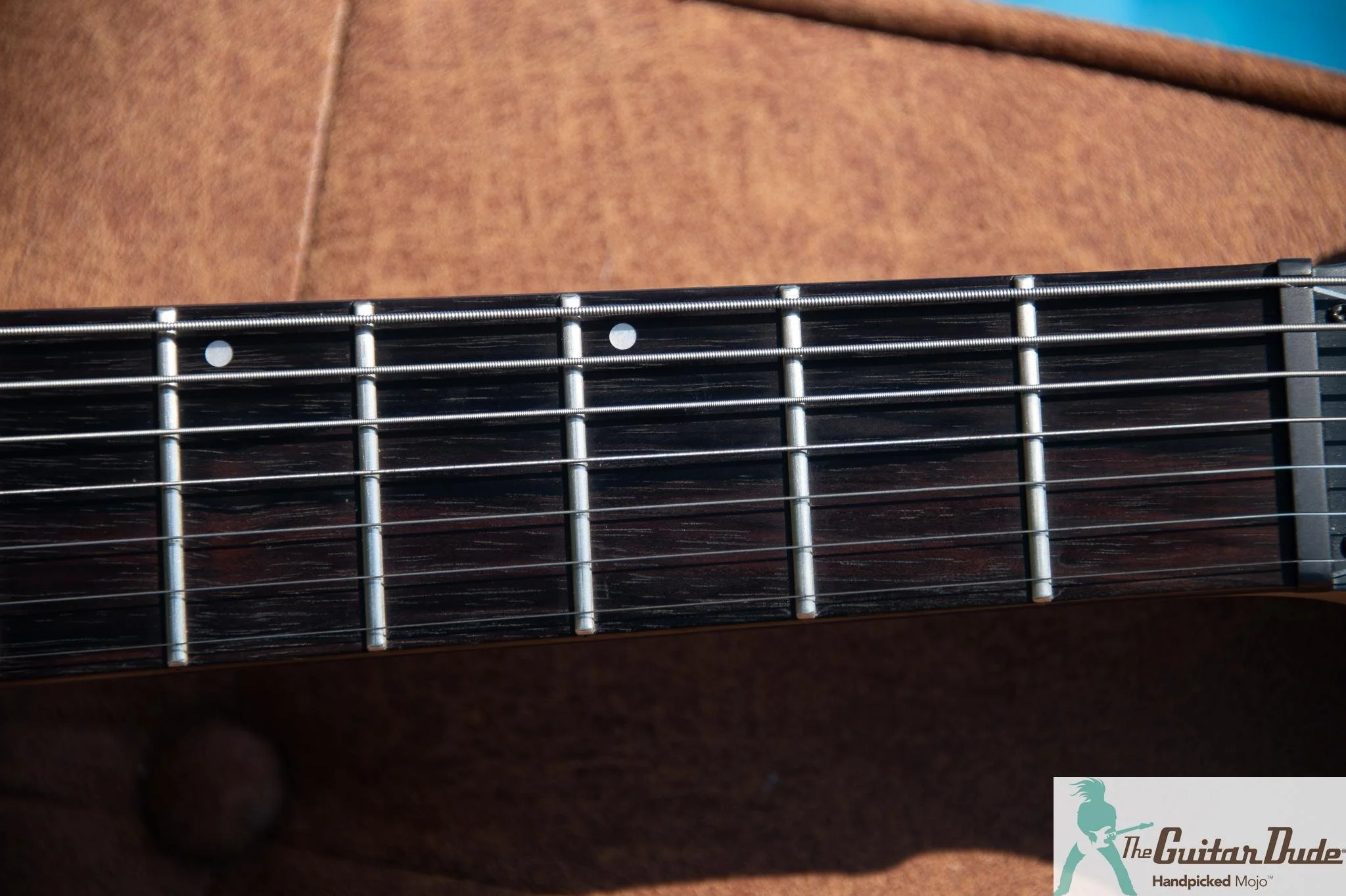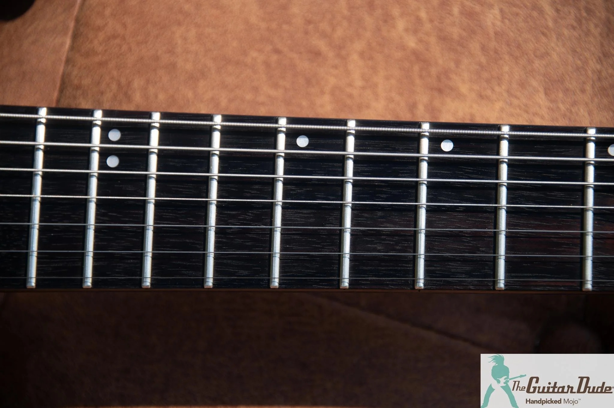 This guitar is professionally set up and dialed in for optimal tone and playability. It has low action with no buzzing or dead spots and is an absolute joy to play. It has been deep cleaned and detailed. All guitars will arrive looking and playing great. The frets have been leveled / dressed / polished and the fingerboard was cleaned. (Unfinished Rosewood and Ebony boards get treated with Fret Doctor - a proprietary all natural oil that is the best on the market) It has brand new strings, the action was adjusted, the intonation is spot on and it plays excellent. All the electronics work flawlessly.